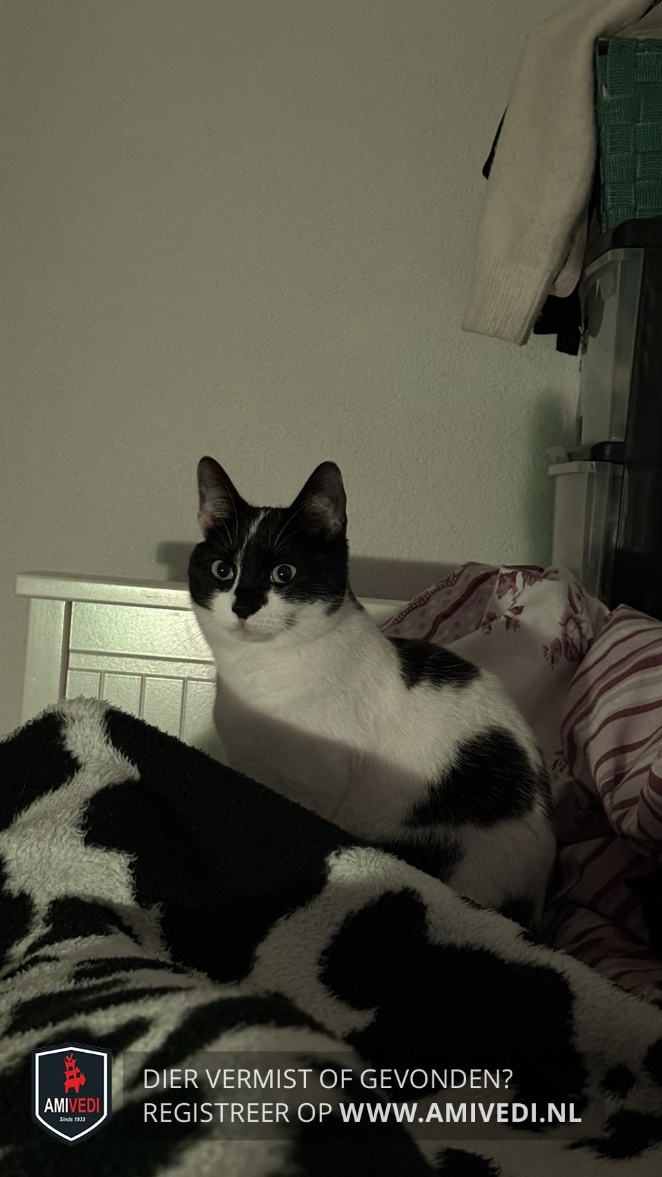 | Signalement | Zwarte kop, vlek op de rug, witte lijn aan rechterkant kopje, rest wit. |