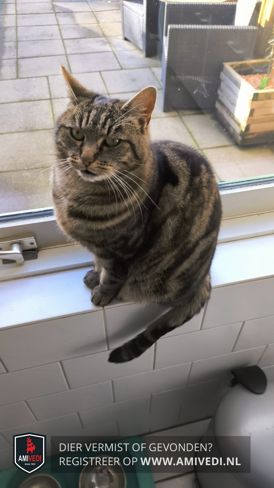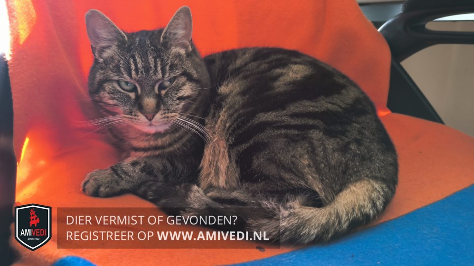| Signalement | Cypersbruine poes met oranje gloed, brede zwarte gemeleerde strepen, grijs/witte kin. |