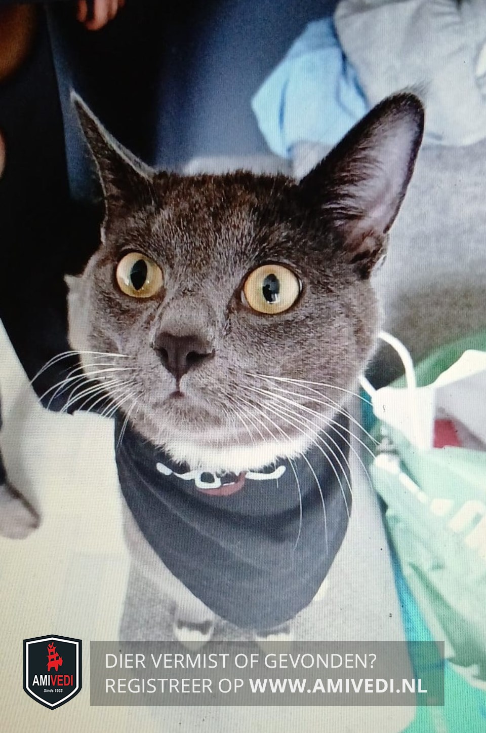 | Signalement | Blauw/grijs en een wit blesje in zijn hals. Kruising Blauwe Rus en Britse Korthaar. |