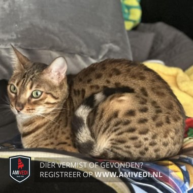 | Signalement | Cypers bruin zwart gevlekte poes, met een bruin zwart gestreepte kop met wat wit aan de bek en kin. Zwarte vlekken over de rug met een bruine ondergrond. Grijs zwart geringde staart. |