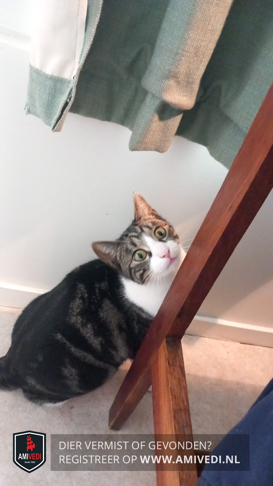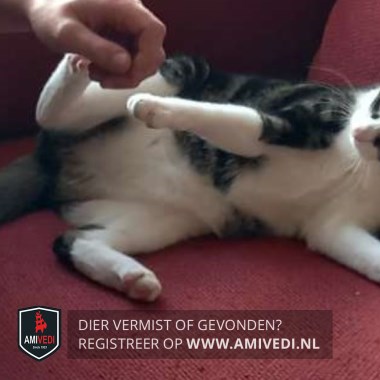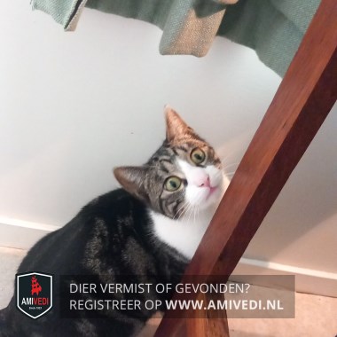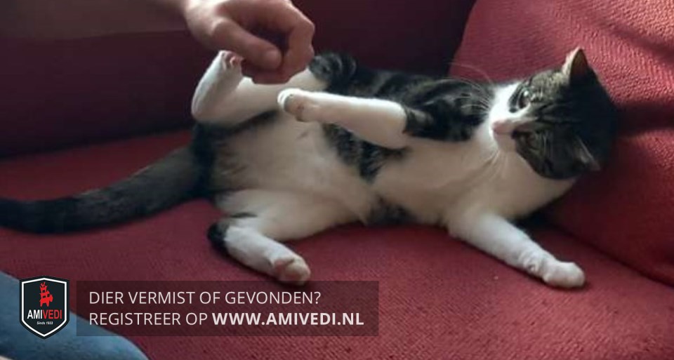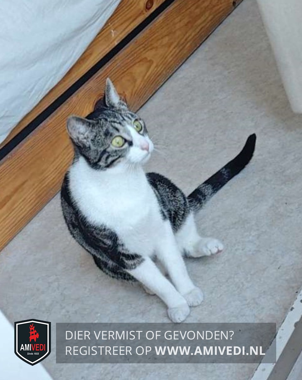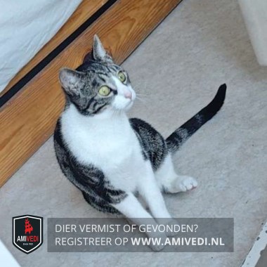 | Signalement | Europese korthaar kater, grijs met zwart en wit Kopje grijs met zwart gestreept en witte bles, witte snuit. Witte bef, witte borst, witte buik, witte voor- en achterpoten. Rest van de vacht is zwart met grijs gemarmerd. Heeft fel groene ogen. |