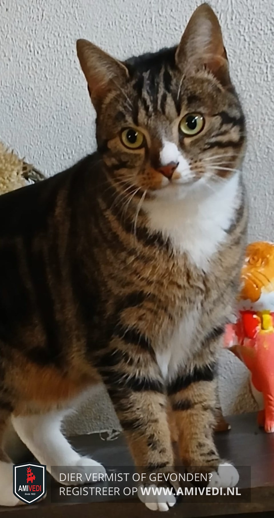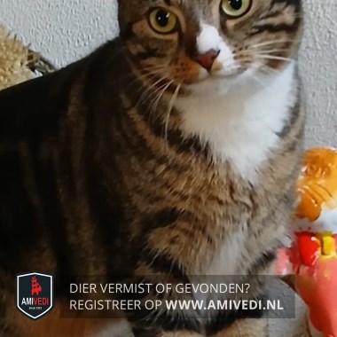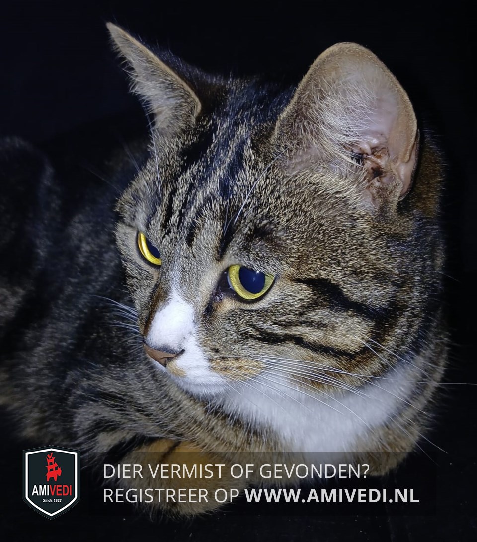 | Signalement | Europese korthaar grijs/bruin met zwart gestreept en wit. Witte vlek op neusje doorlopend naar witte snor met een klein bruin vlekje. Rechtersnor bruin met een wit vlekje, witte kin, witte bef, witte buik. Voorpootjes met witte teentjes, achterpootjes met witte kniekous en witte sok. |