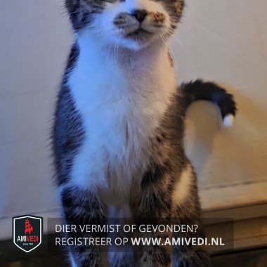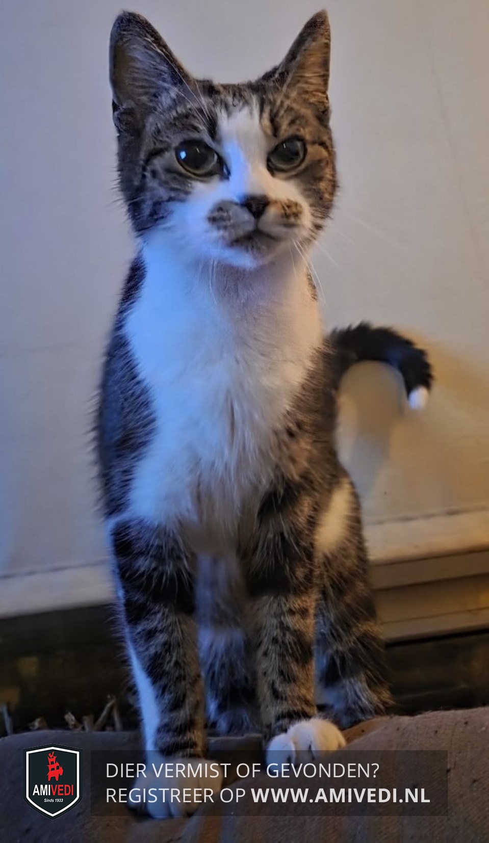 | Signalement | Cypers grijs/zwart gestreept met wit. Wit tussen haar ogen en grijs op haar wangen en kin met wit erom heen. Witte borst. In ieder geval witte voetjes aan haar voorpoten wat rechts aan de zijkant doorloopt naar boven. Wit puntje op de staart |