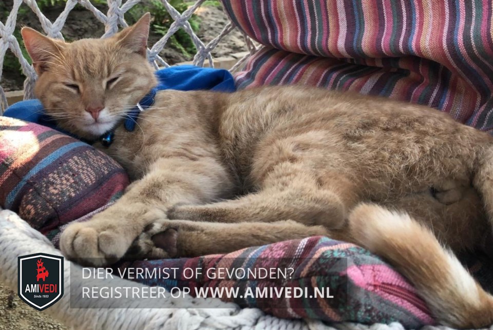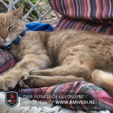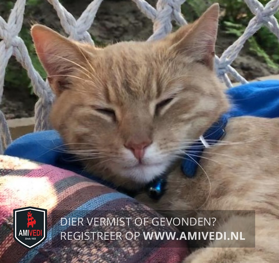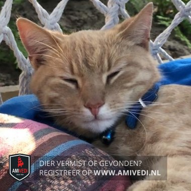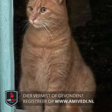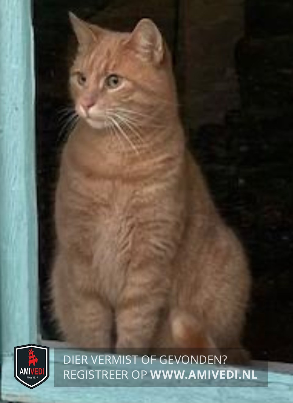 | Signalement | Een geheel rood/crème cypers gestreepte kater. Rond het bekkie wat lichter van kleur. Gele ogen. |