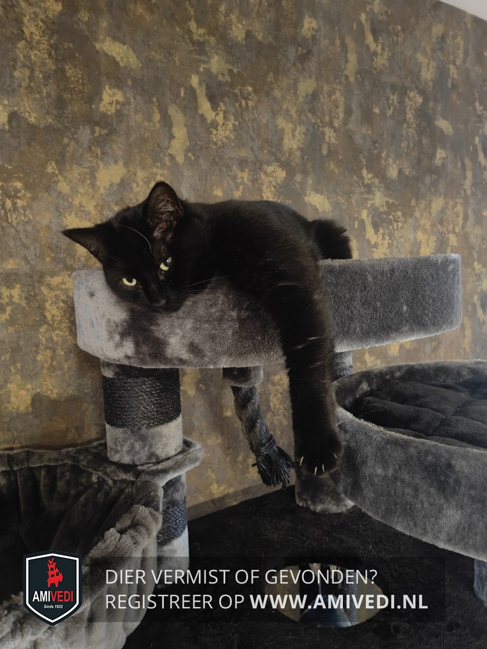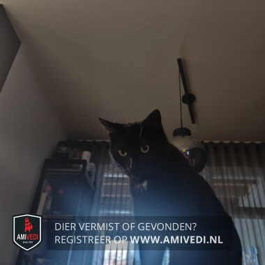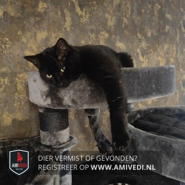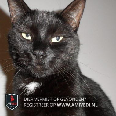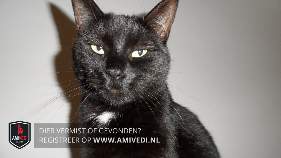 | Signalement | Europese korthaar kater, zwart met wit. Klein plukje wit op de borst en een streepje wit tussen de voorpoten. |