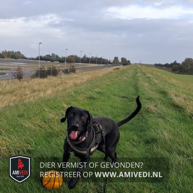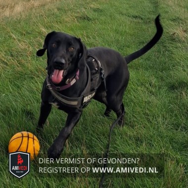 | Signalement | Labrador kruising, zwart met een wit vlekje op de borst en een paar witte tenen. Bruine ogen. Tuig: zwart (Julius K9 met handvat) |