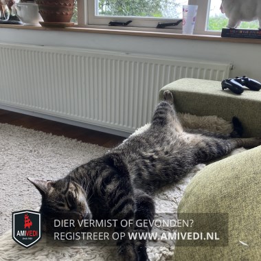 | Signalement | Cypers grijs/zwart gestreept. Snuitje deels en kin wit. Klein wit plekje op het befje. Lichte randen rondom de ogen. Lichtere onderbuik. Iets dunner/kleiner voor de leeftijd. Heel spraakzaam. |