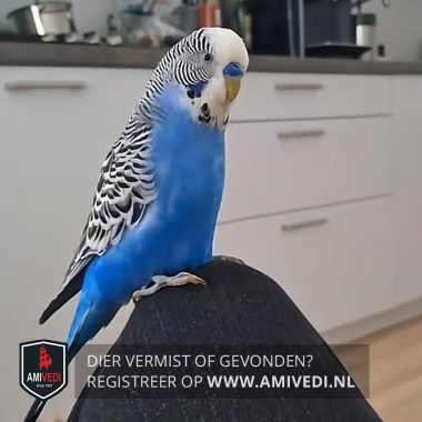 | Signalement | Witte kruin en voorhoofd. Blauw vlekje direct boven de gele snavel. Witte kin. Wit/zwart gestreepte nek, rug en vleugels. Blauwe borst, flank en buik. Staart begint blauw eindigt zwart. Heel tam, niet mensenschuw. |