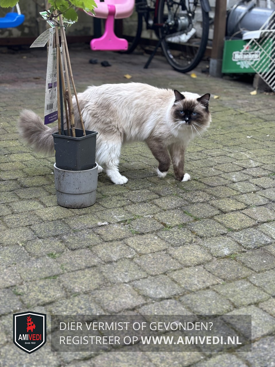 | Signalement | Ragdoll met 'point'-tekening: donkere oren, donker masker, voorpootjes zijn donker met witte teentjes; rechter bovenlip wit, linker bovenlip vrijwel geheel donker. Klein wit stipje op de neus. Grote, helderblauwe ogen; lijfje, staart en achterpoten beige en wit(tig). LET OP: binnenkat! |