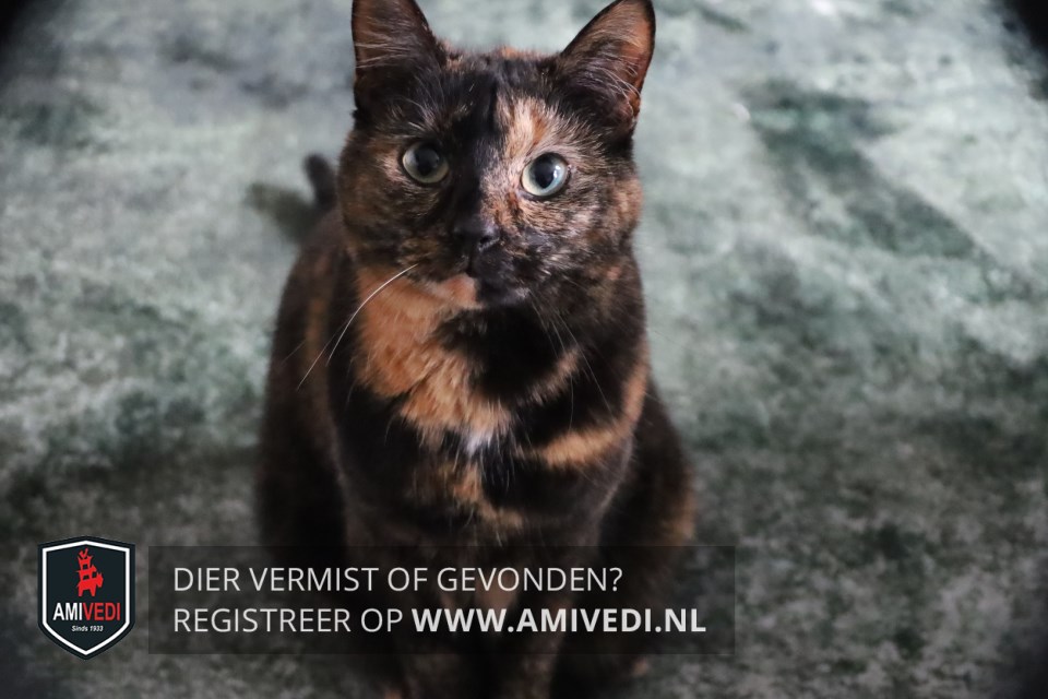| Signalement | Schildpadpoes met zwart en rood/oranje, de kin is voor de helft rood/oranje is en de andere helft zwart, klein wit vlekje op de borst. |