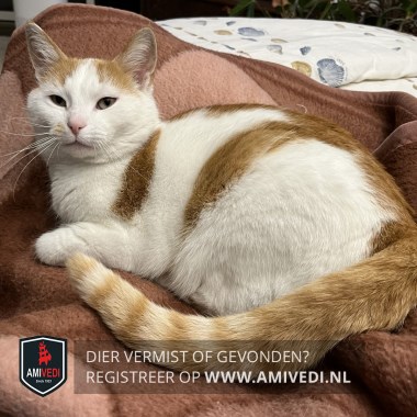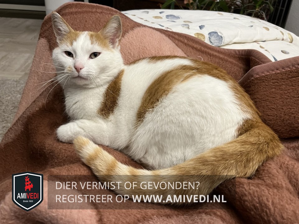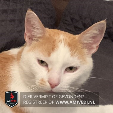 | Signalement | Wit/rood. Witte snoet en bles met licht rood vlekje rechts naast neusvleugel. Witte kin bef en borst. Rood op de rug. gestreepte staart. Knipje in zijn oor. |