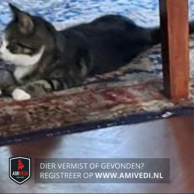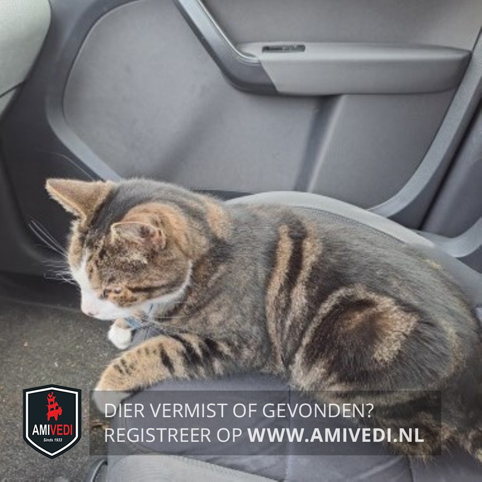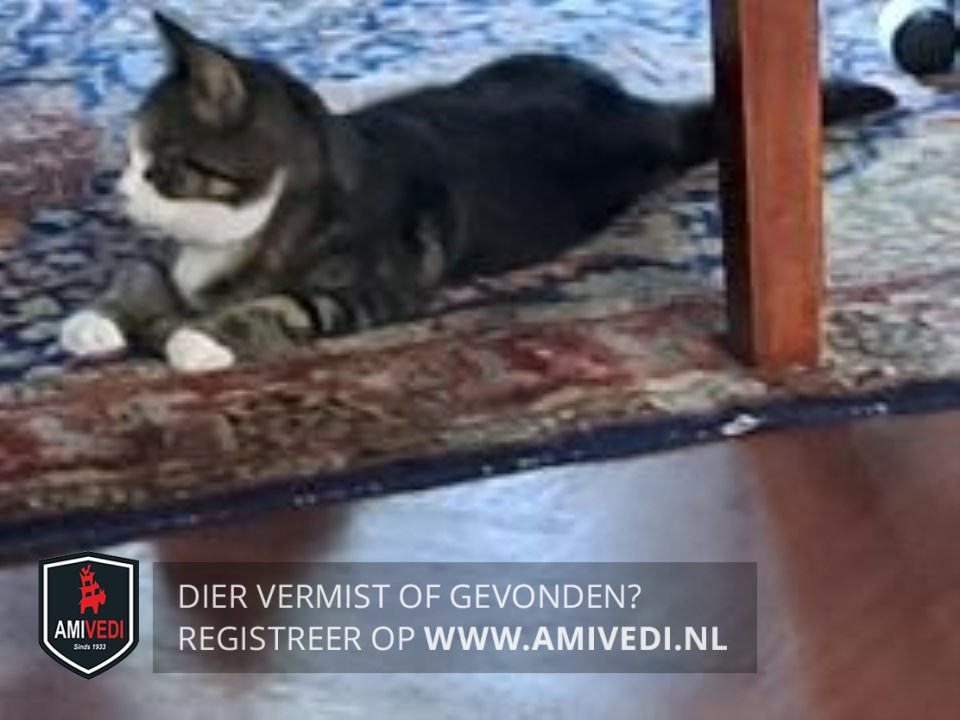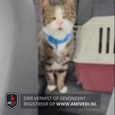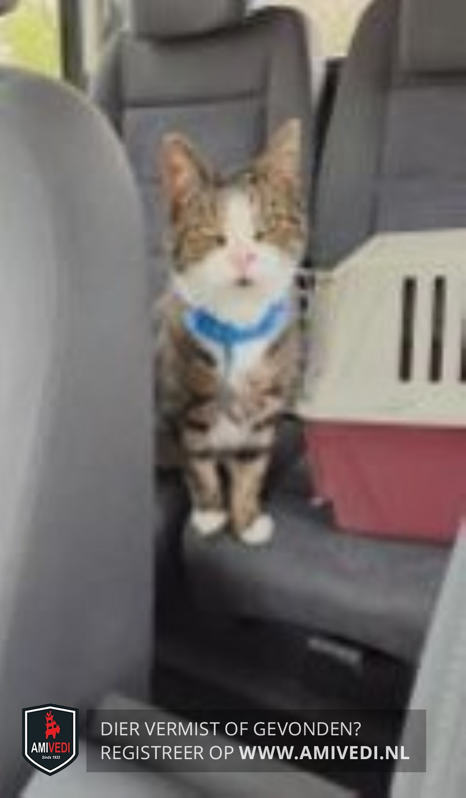 | Signalement | Europese korthaar, Zwart/rood/ wit gestreept. Wit neusje, met witte streep op voorhoofd. Grote zwarte vlek op de kop, die overgaat naar rode vlek in nek. Witte onderkin. Voorpootjes witte tenen. Heeft blauwe halsband om. |