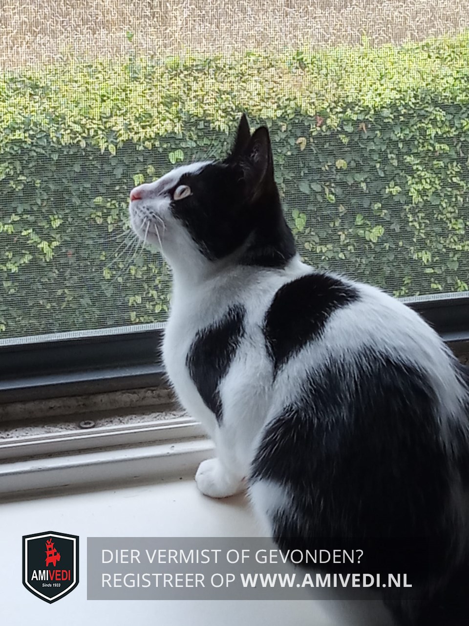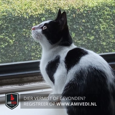 | Signalement | Wit/zwart gevlekte poes. Zwart op het kopje dat doorloopt over en langs de oogjes. Verder wit snuitje, roze neusdop. Witte hals, borst en buik. Op de linker schouder een zwarte vlek. Midden op de rug een zwarte vlek. Op de onderrug zwart dat doorloopt over de billen. Witte pootjes. Zwarte staart. Reageert op haar naam. |