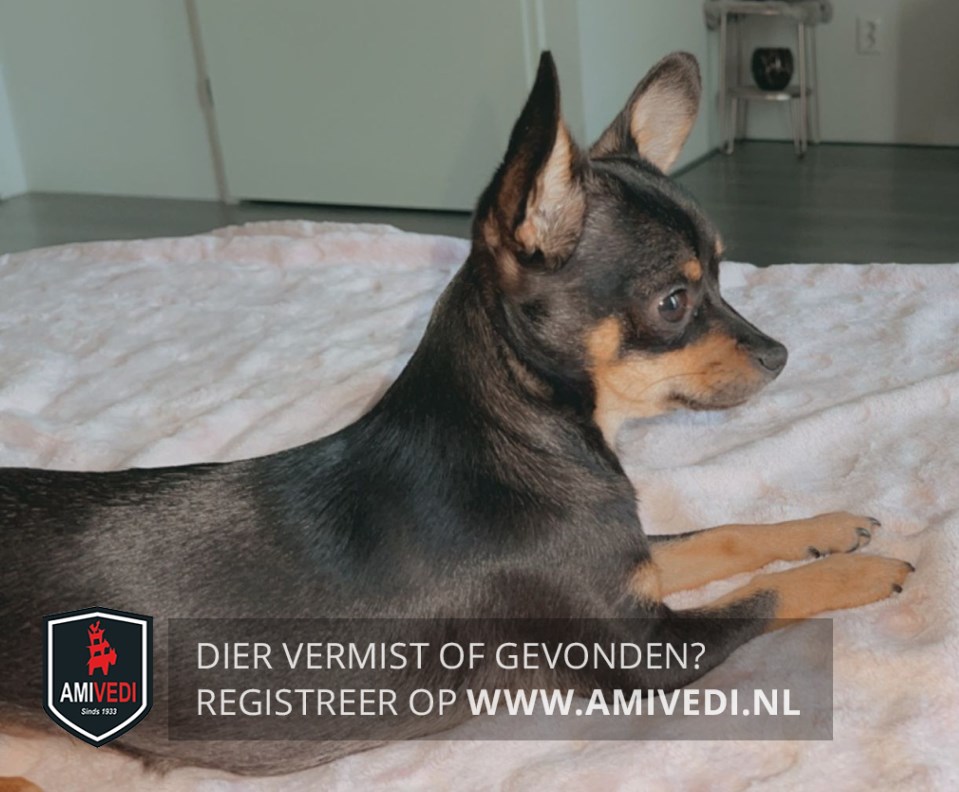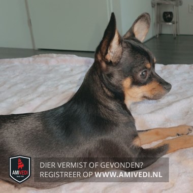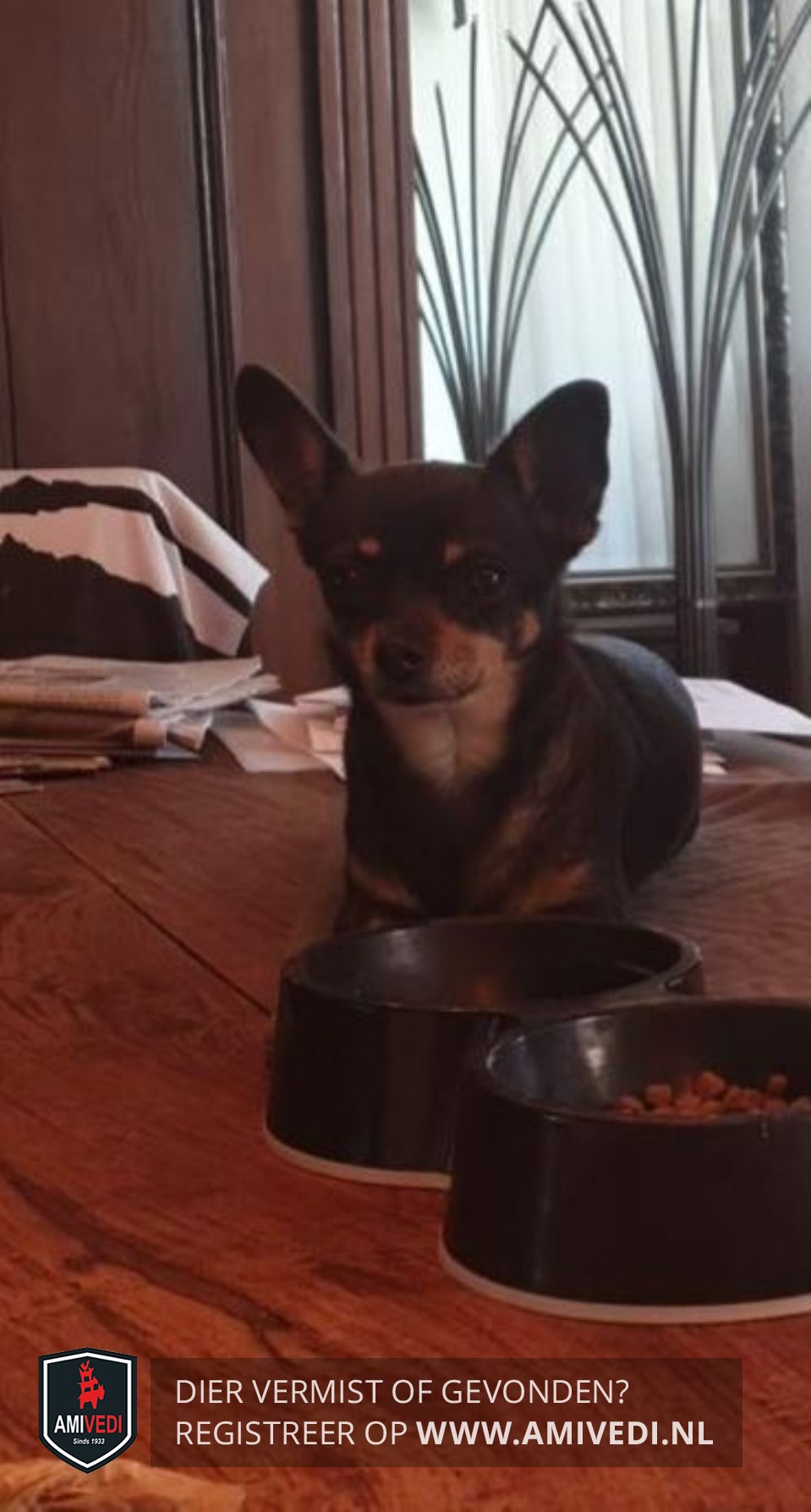 | Signalement | Chihuahua, zwart met bruin. Bruine vlekjes boven de ogen, wangen bruin met zwarte kin, Bruine bef, bruin bij de voorpootjes. |