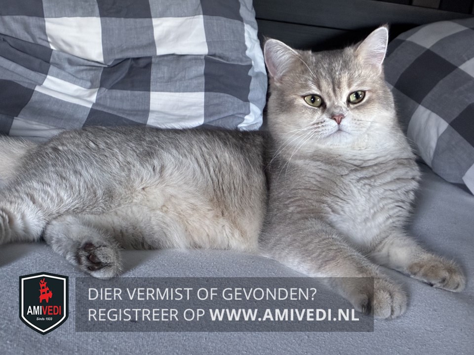 | Signalement | Klein licht grijs/beige met een witte snuit. Licht groene ogen. |