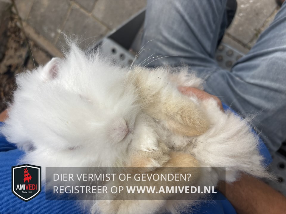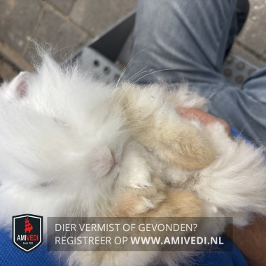 | Signalement | Wit/bruin. Langharig Konijn. Hoofdzakelijk wit met bruin/beige poten. Blauwe ogen. |