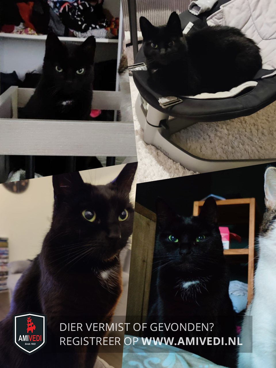 | Signalement | Geheel zwarte kater met wat witte haartjes op de borst. Groene ogen en een zwart neusje. Op het moment van vermissing droeg Smokey een grijs vlooienbandje. |