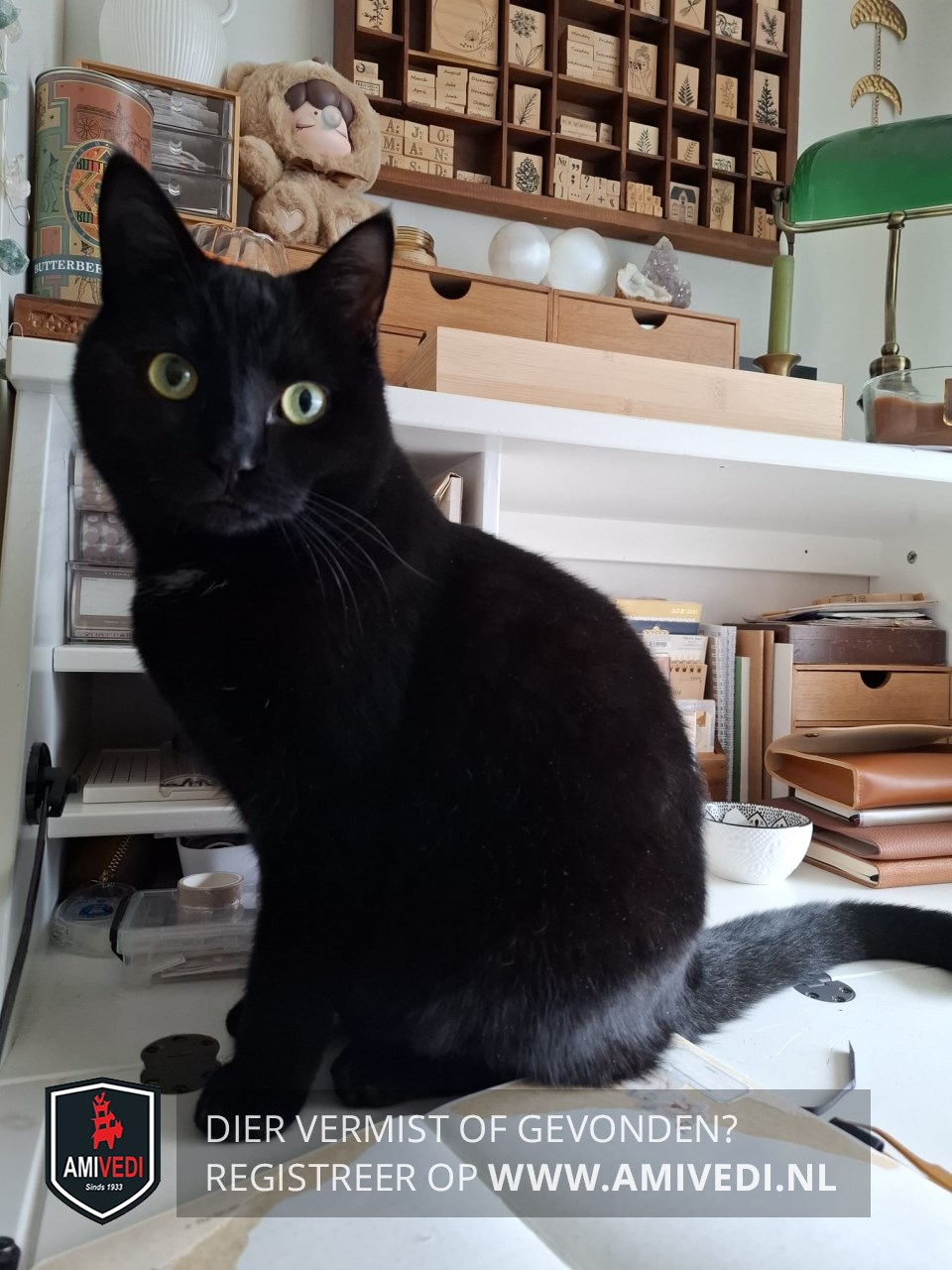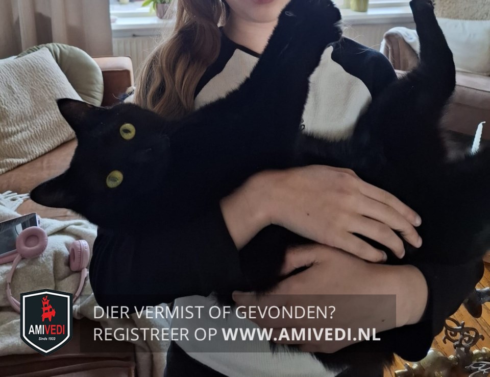 | Signalement | Geheel zwart op wit plukje op de borst na. Zwarte nagels , zwarte voetkussentjes, met groene ogen. |