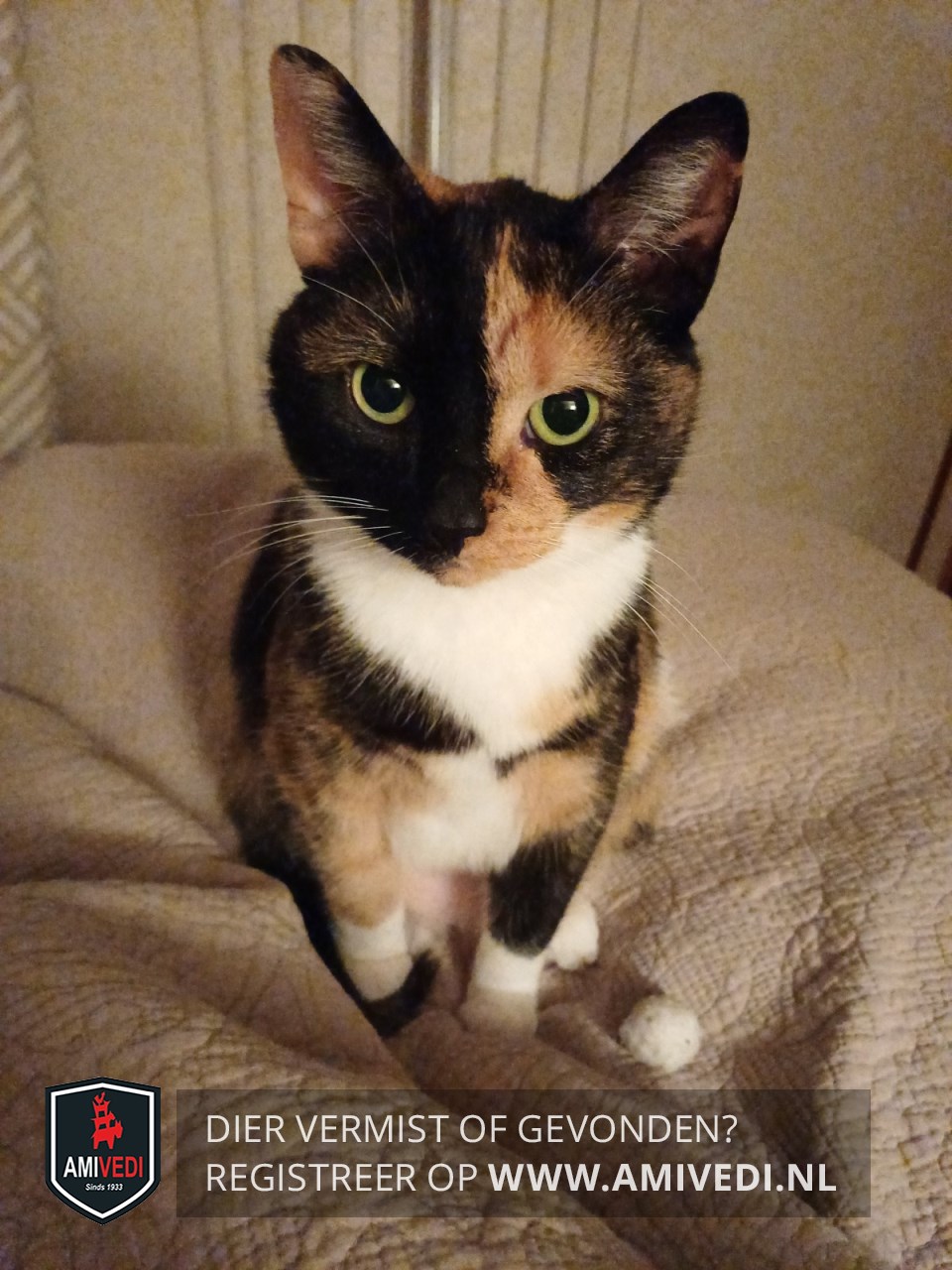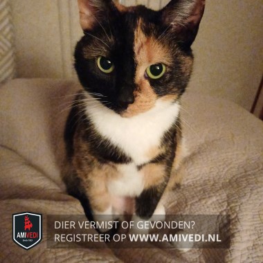 | Signalement | Schildpadpoesje, rechterkant van het gezichtje veel zwart, linker kant van het gezichtje veel rood. Witte hals en bef. Wit op de buik en witte sokjes. Lijfje is zwart/rood/wit gemêleerd. Zwarte staartpunt. |