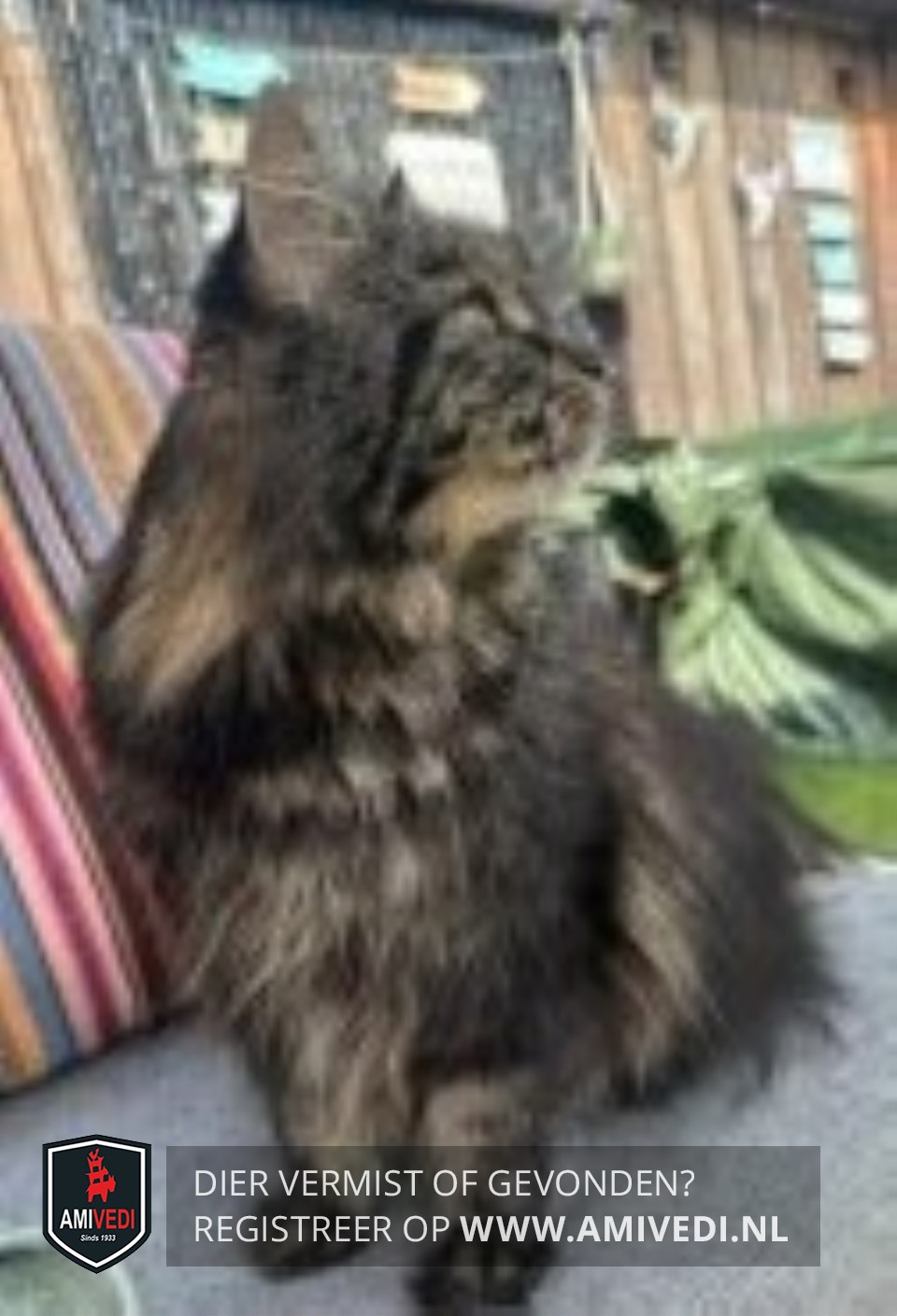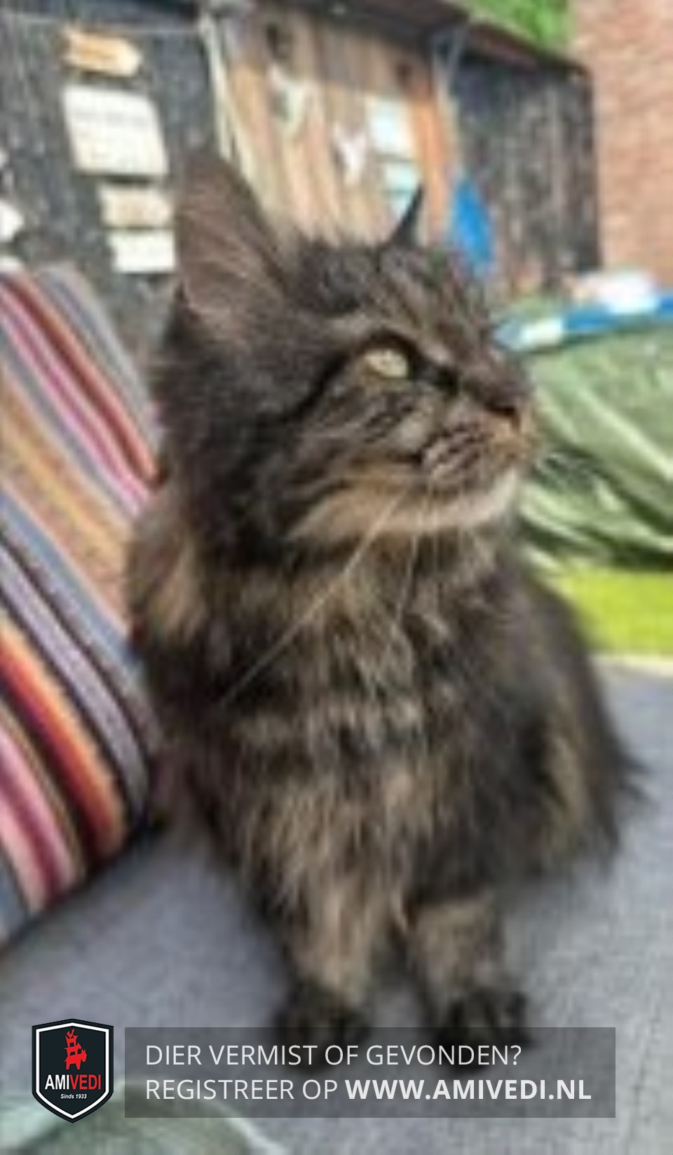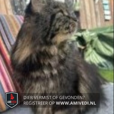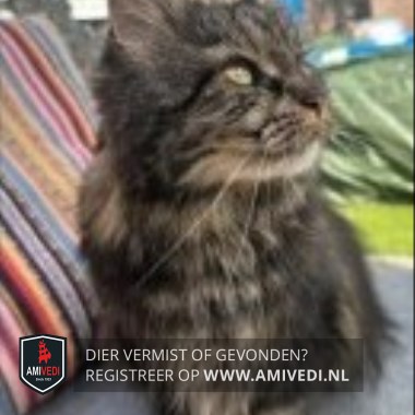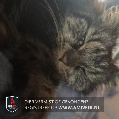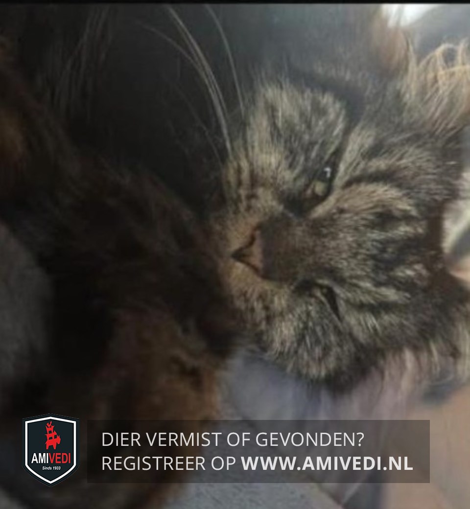 | Signalement | Cypers grijs met zwart. Onder de bek bruin. Over het lijf hier en daar een bruine plek. Schuw. |