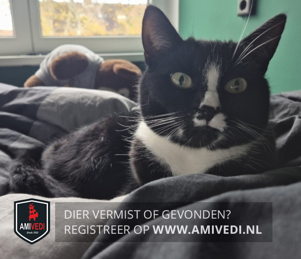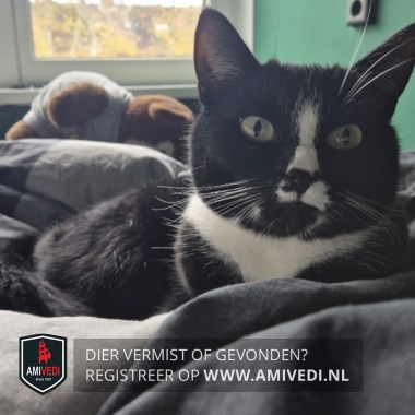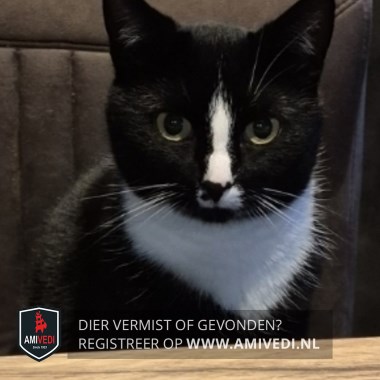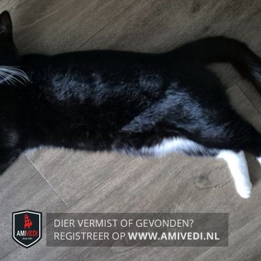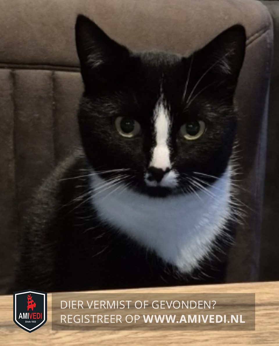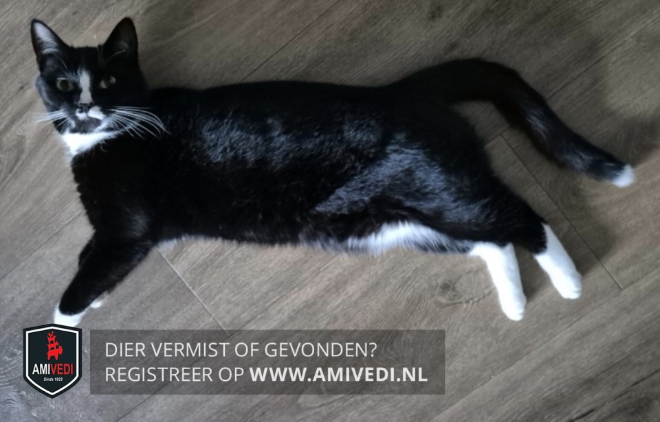 | Signalement | Zwart-witte kater. Witte bles, zwarte neuspunt. Wit onder de neus, links meer dan rechts. Eiyte bef en wit tussen de poten. Voor witte voetjes, achter witte sokjes. Witte punt aan zijn staart. |