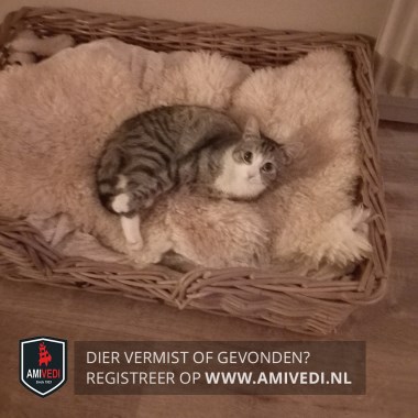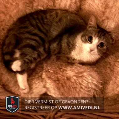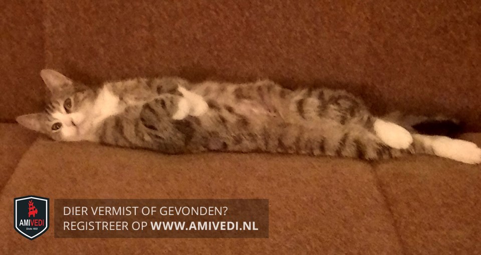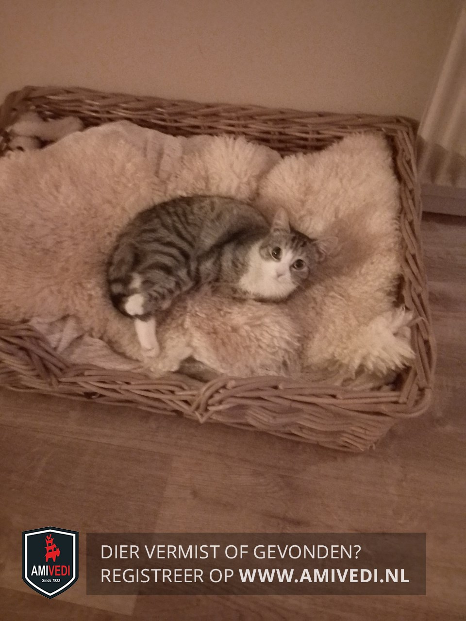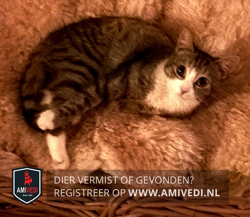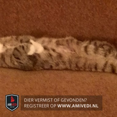 | Signalement | Kleine cypers bruin-zwart gestreepte poes met wit. Witte snuit en witte bef. Rechtsvoor witte tenen, linksvoor wit voetje. Achter witte sokjes. |