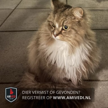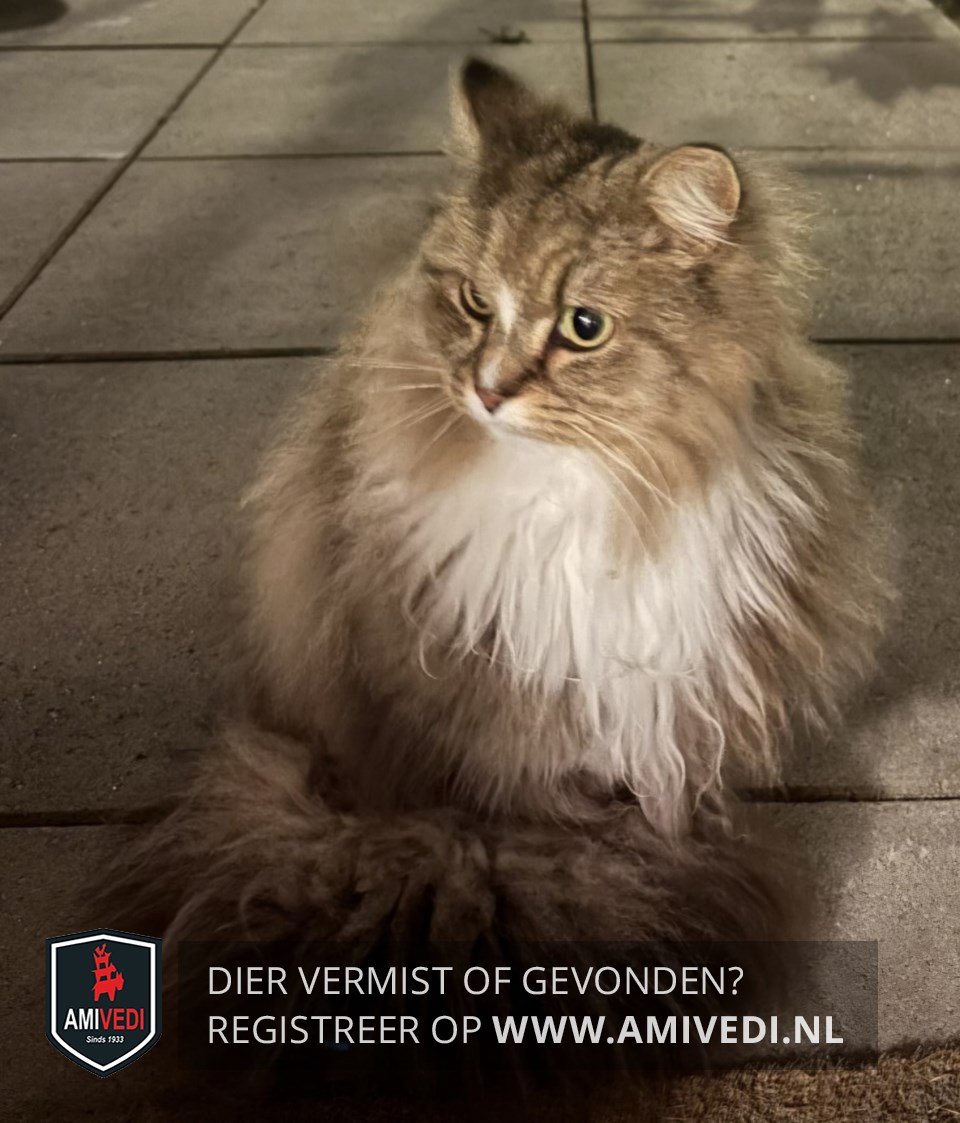 | Signalement | Langharige cypers bruin/beige-zwart met-witte kat. Wit vlekje bovenaan de neus, onderaan de neus en onder de neus. Witte kin en bef. Pluizige staart. Is met een wandelaar een uur meegelopen (meermaals teruggezet). |