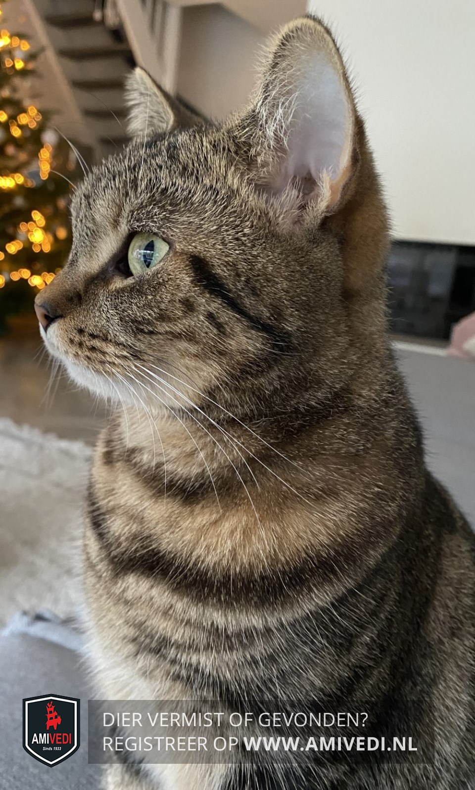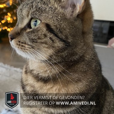 | Signalement | Cypers bruin/zwart gestreept met beige/wit. Tabby korthaar, |