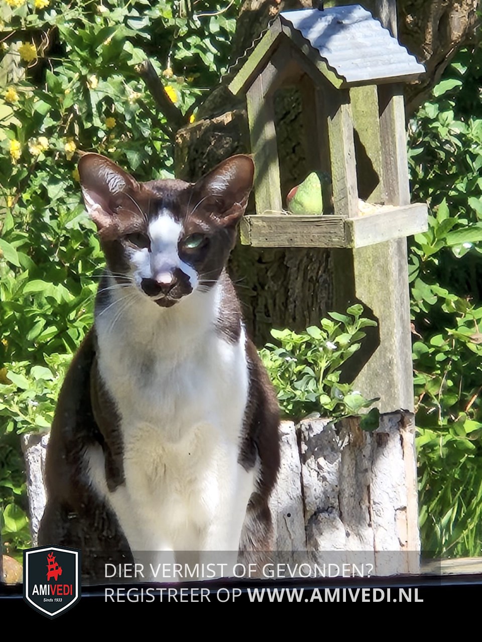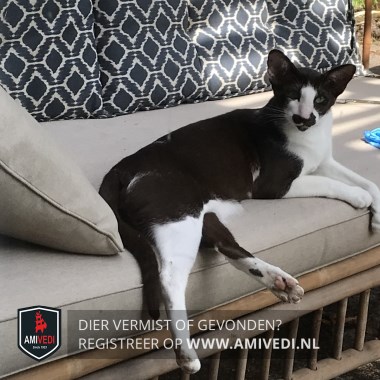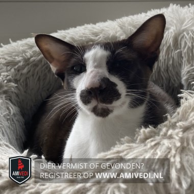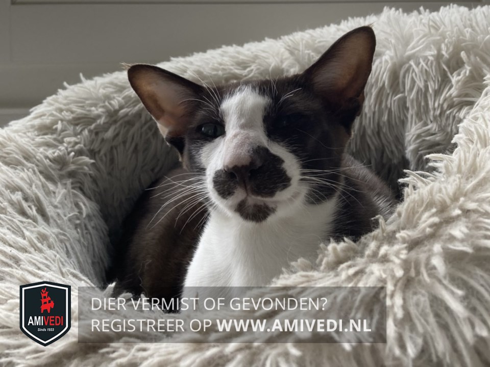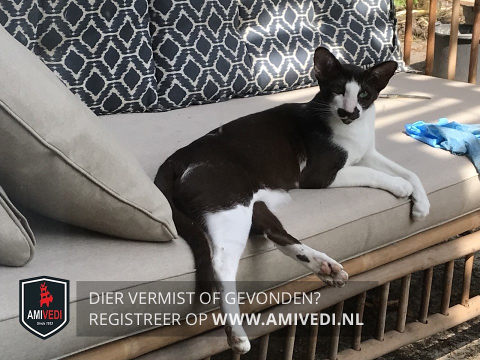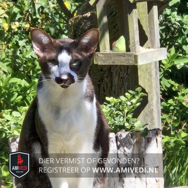 | Signalement | Oosterse korthaar. Donkerbruin rondom de ogen, snor, kin, oren en achterhoofd. Witte snuit, bef, buik en poten. Donkerbruine rug en staart. Groene ogen. |