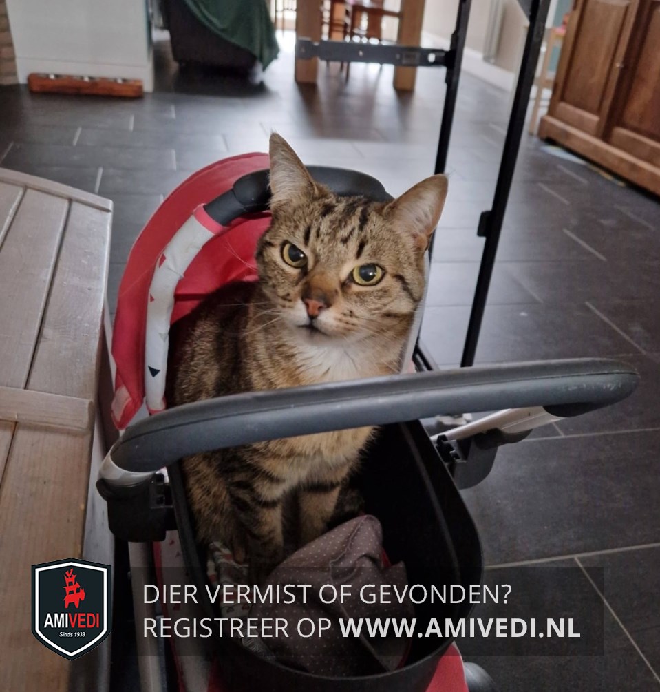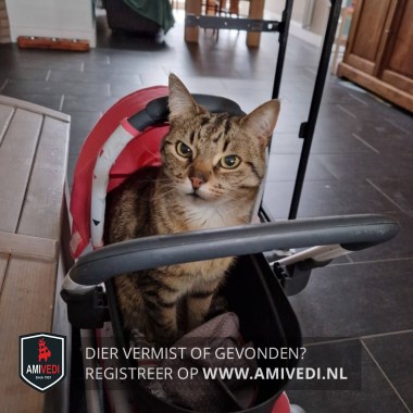| Signalement | Cypers bruin/zwart gestreept met een licht kleurig befje, kin en onder de neus. |
