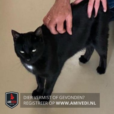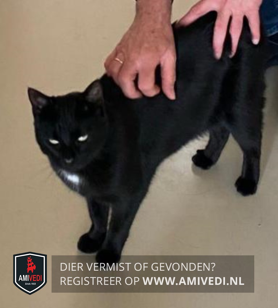 | Signalement | Volledig zwarte kater met allen op de borst een ronde witte vlek. De ogen van de kater zijn groen. |
