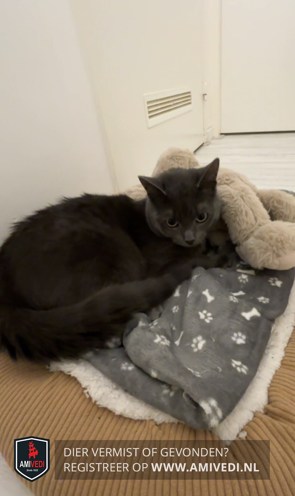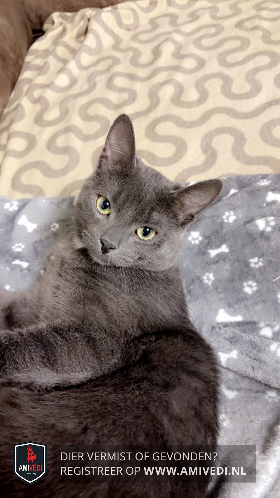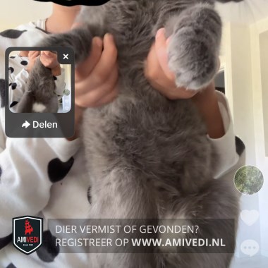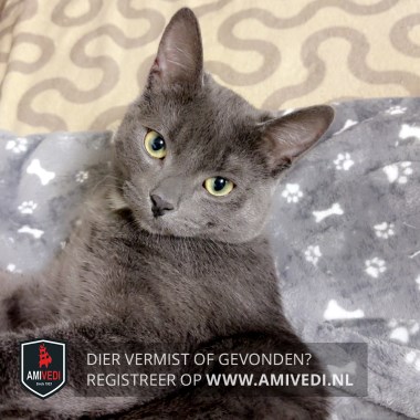 | Signalement | De poes lijkt helemaal egaal grijs, maar als je goed kijkt zie je door de grijze vacht overal zwarte strepen. Op de pet van de kop zie je boven beide ogen 2 verticale zwarte strepen. De ogen van de poes zijn groen en geel. De bles, het bekje en de wangen van de poes zijn grijs. Het neusje is zwart. De snorharen zijn wit. Over de rug, de flanken en de pootjes lopen zwarte strepen door de grijze vacht. Onderaan de rechter voorpoot en onderaan de buik heeft de poes een witte vlek. |