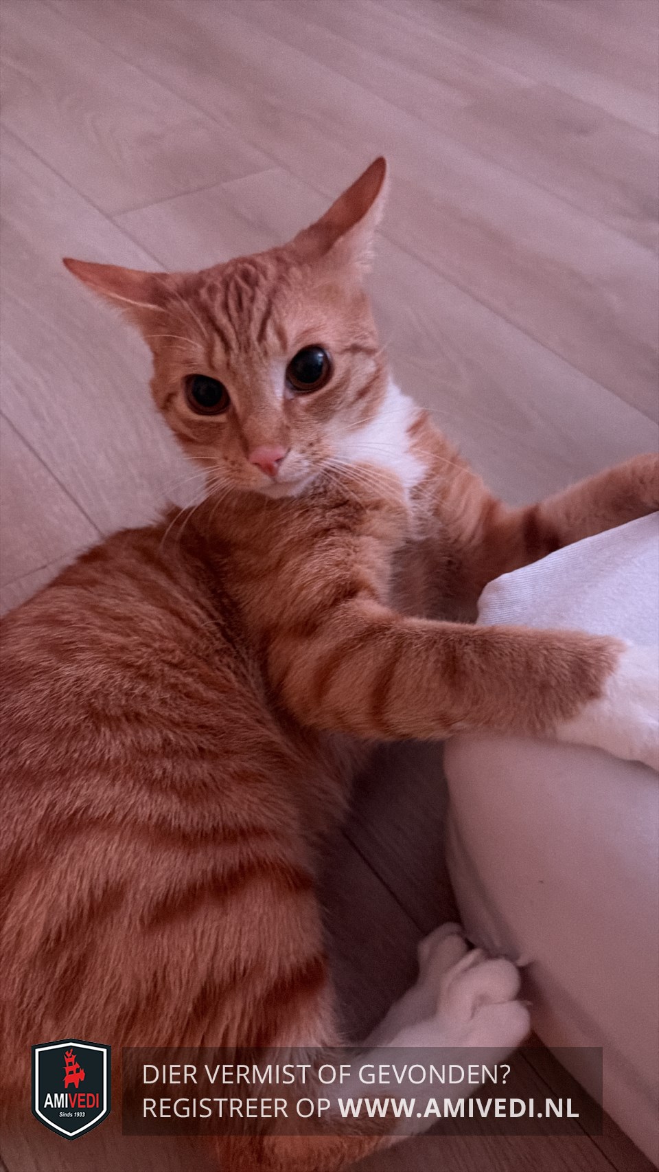 | Signalement | Cypers gestreept in de kleur rood/oranje en wit. De kat heeft op de pet verticale strepen in rood/oranje en boven de ogen in de wenkbrauw 1 verticaal streepje in rood. De vacht boven de ogen is oranje. De ogen zelf zijn helemaal zwart en oranje omrand. De wangetjes zijn rood/oranje. De bles is oranje met een roze neus. De snoet en het bekje zijn wit met witte snorharen. De hals is tevens wit. Verder is de vacht op de rug doorlopend naar de staart rood/oranje gestreept. Dit patroon zet zich ook door naar de pootjes. De achterpoten hebben een witte kniekous en de voorpoten witte sokjes. |
