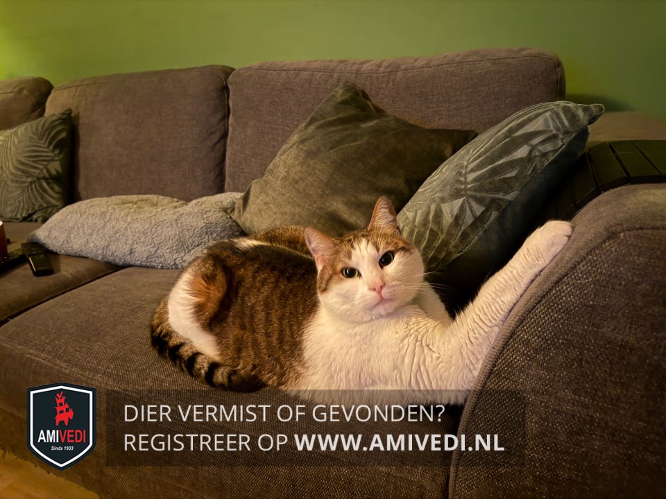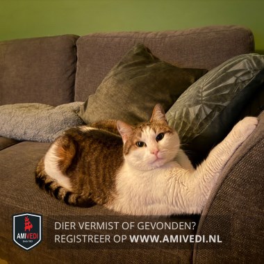 | Signalement | Gestreepte straat. Grote gestreepte vlek op zijn lichaam. Heeft een halsband met kokertje eraan. |