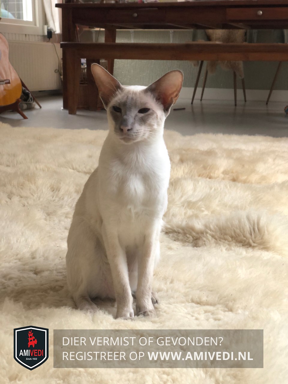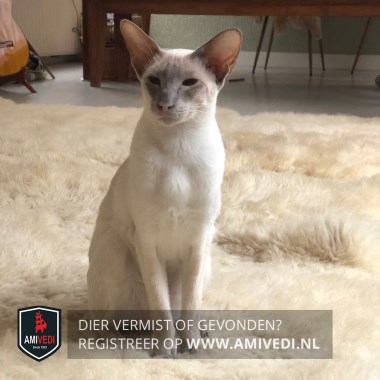 | Signalement | Siamees met grijze points (uiteinde: oren, pootjes en staart zijn grijs) wigvormige kop, grote oren, blauwe ogen, hoog op de poten, lang rank lichaam, dunne zweep staart |