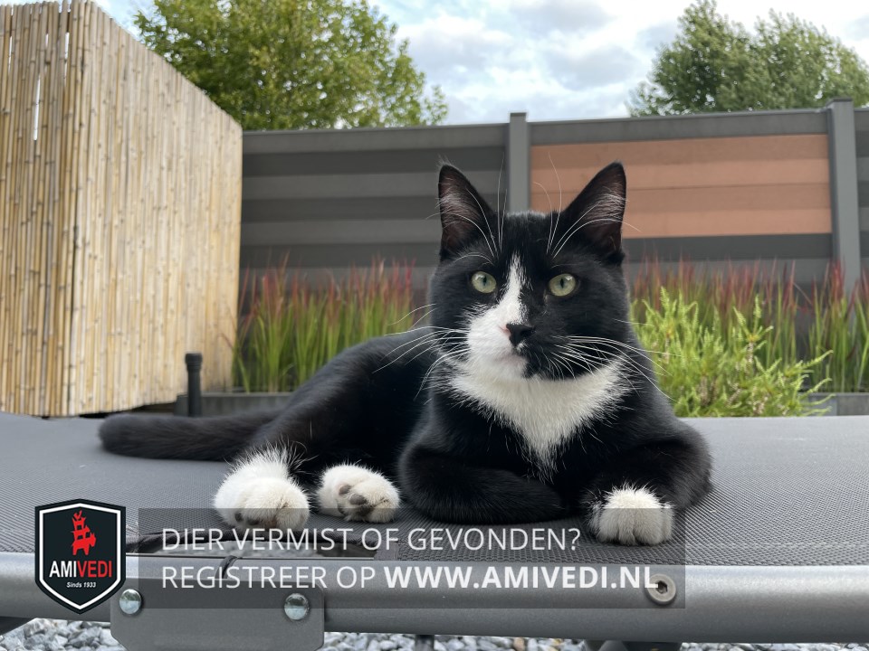 | Signalement | Zwart , de rechter helft van de neusbrug, snuit en bek is wit. Witte borst en buik. Voorpoten hebben witte tenen, achterpoten witte sokken. |
