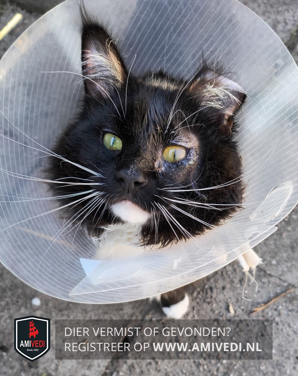 | Signalement | Maine Coon zwart met wit. Witte kin en witte bef, linker voorpootjes met witte teentjes. Draagt een kap ivm. operatie aan ooglid, heeft medicatie nodig! |