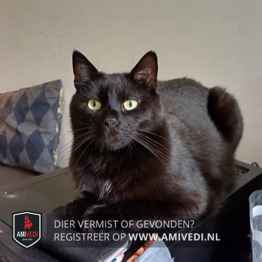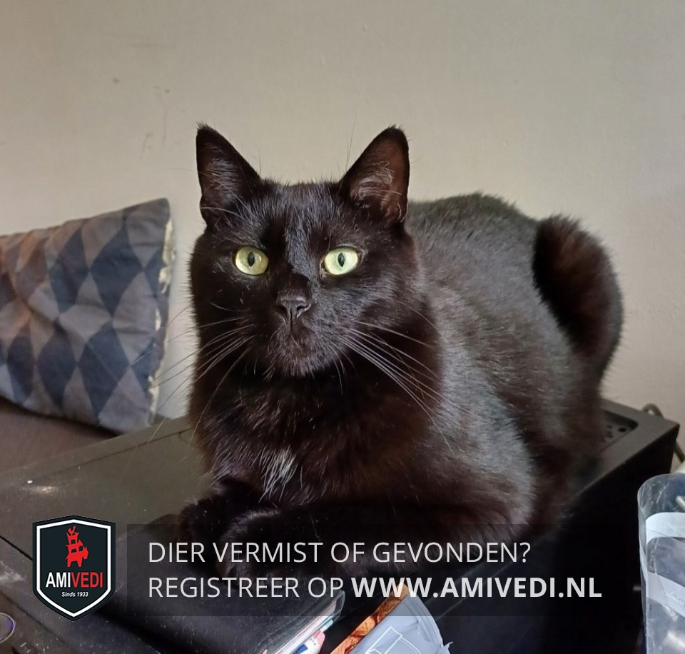 | Signalement | Geheel zwarte kater met heel kleine witte plek op de borst. De ogen van de kater zijn groen. |