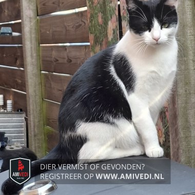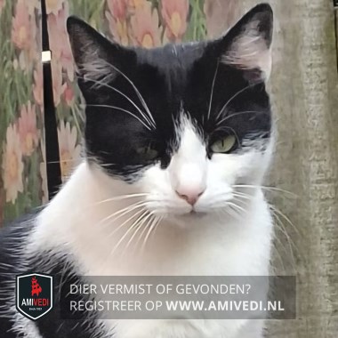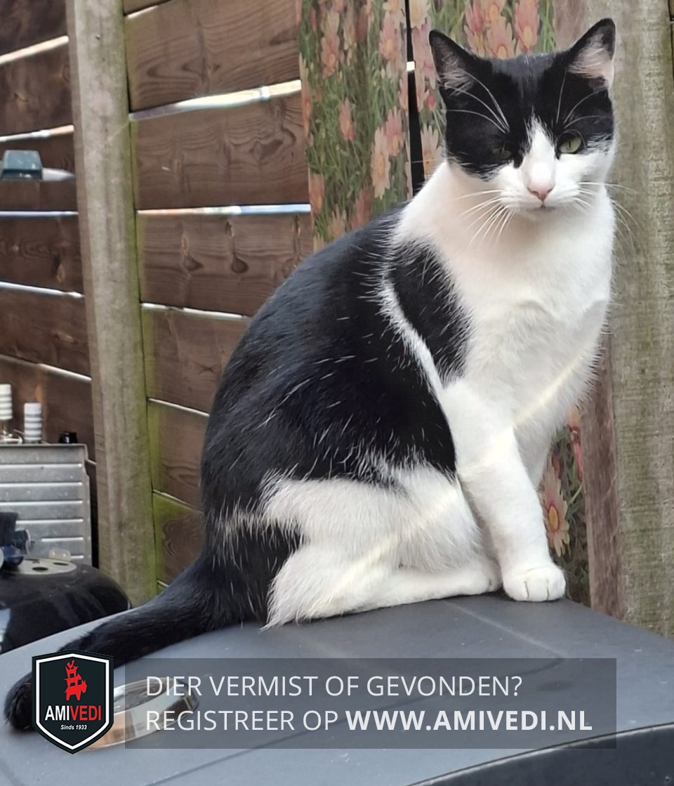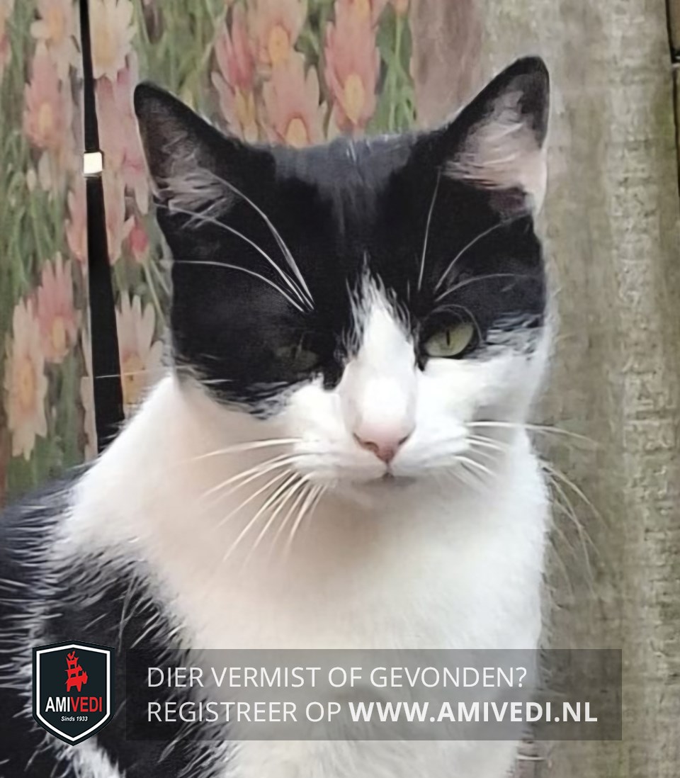 | Signalement | Zwart-witte poes. Witte snuit, zwart overogen en rechter oor. Linker oor zwart-wit. Witte nek, borst, buik en poten. Zwart over rug, flanken en staart met wat witte haartjes erdoor. Zwarte vlek op rechter schouderblad. Groene ogen. |