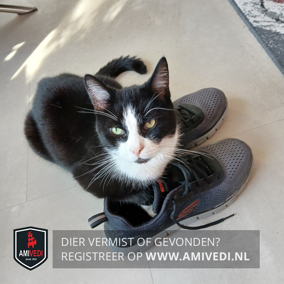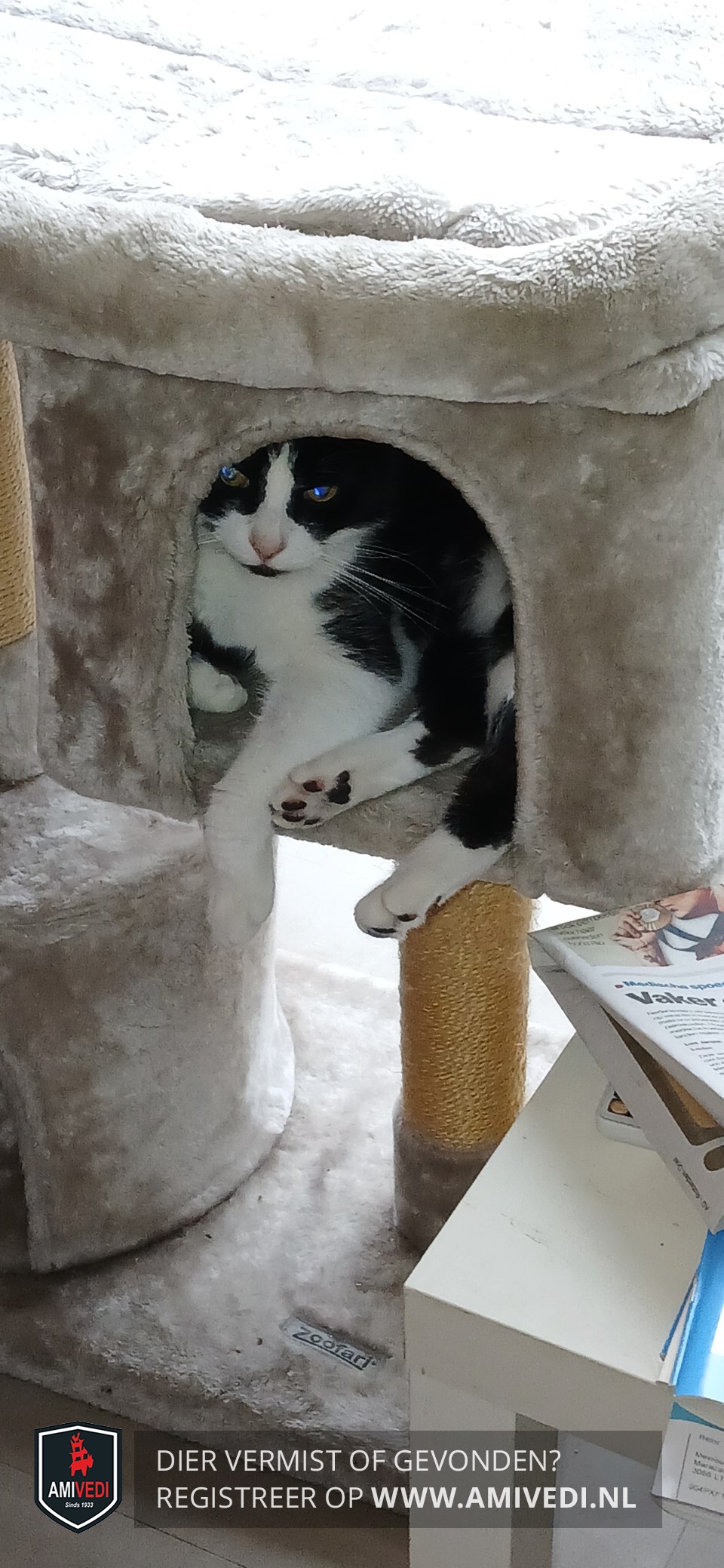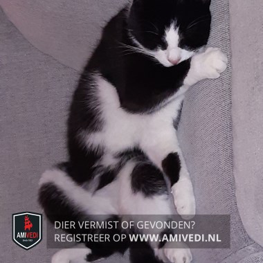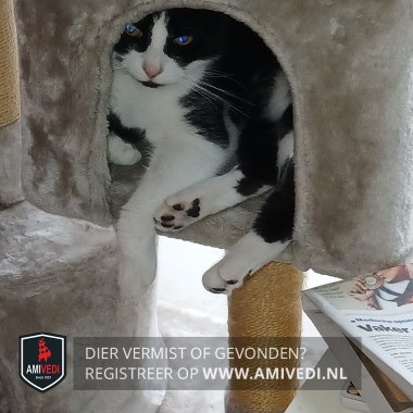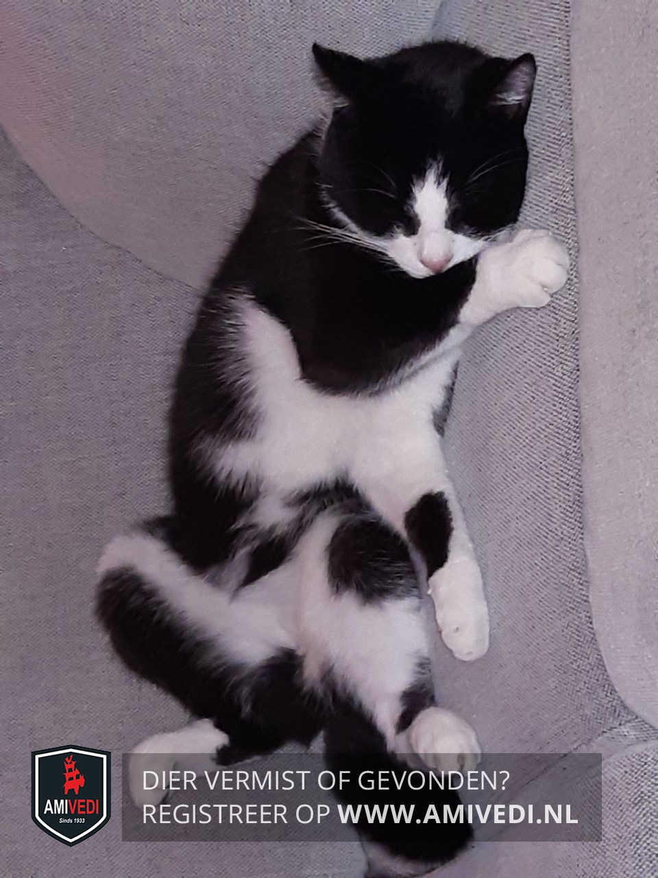| Signalement | Zwart met witte kater, zwarte oortjes en oogjes, witte bles, witte snuit met een zwart kinnetje. Witte bef, borst en witte onderkant. Zwarte kraag en rug, zwarte staart met een witte onderkant. Rechter voorpootje is wit, linker voorpootje heeft een zwarte bovenkant, rechtsachter een zwart pootje met een witte kous en linksachter een witte poot met een zwarte knie en een zwarte vlek op de enkel. |