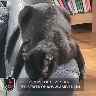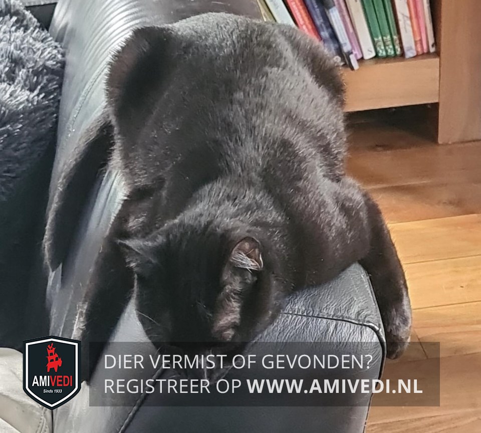 | Signalement | Zwart/wit. Geheel zwarte kat met witte ondervacht Smoke kleur. Klein wit vlekje onder de kin (bef). |