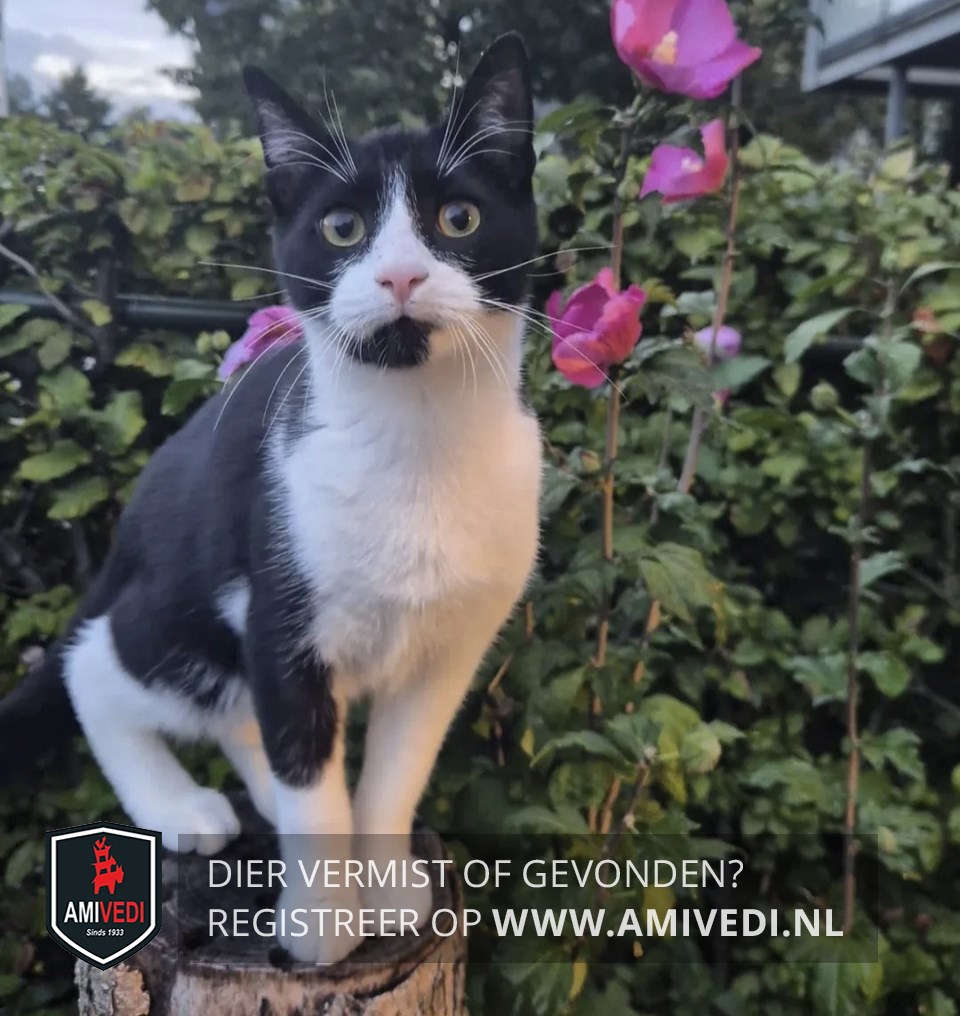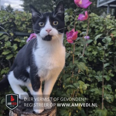 | Signalement | Zwart-witte kater, witte bles, zwarte vlek rechterkant kin, witte poten met zwarte vlek bovenkant rechtervoorpoot, witte borst en buik, witte achterpoten, zwart bij ogen, oren, rug en staart. |