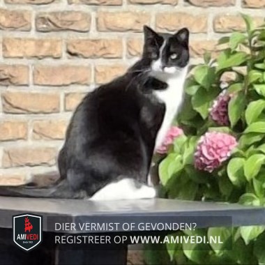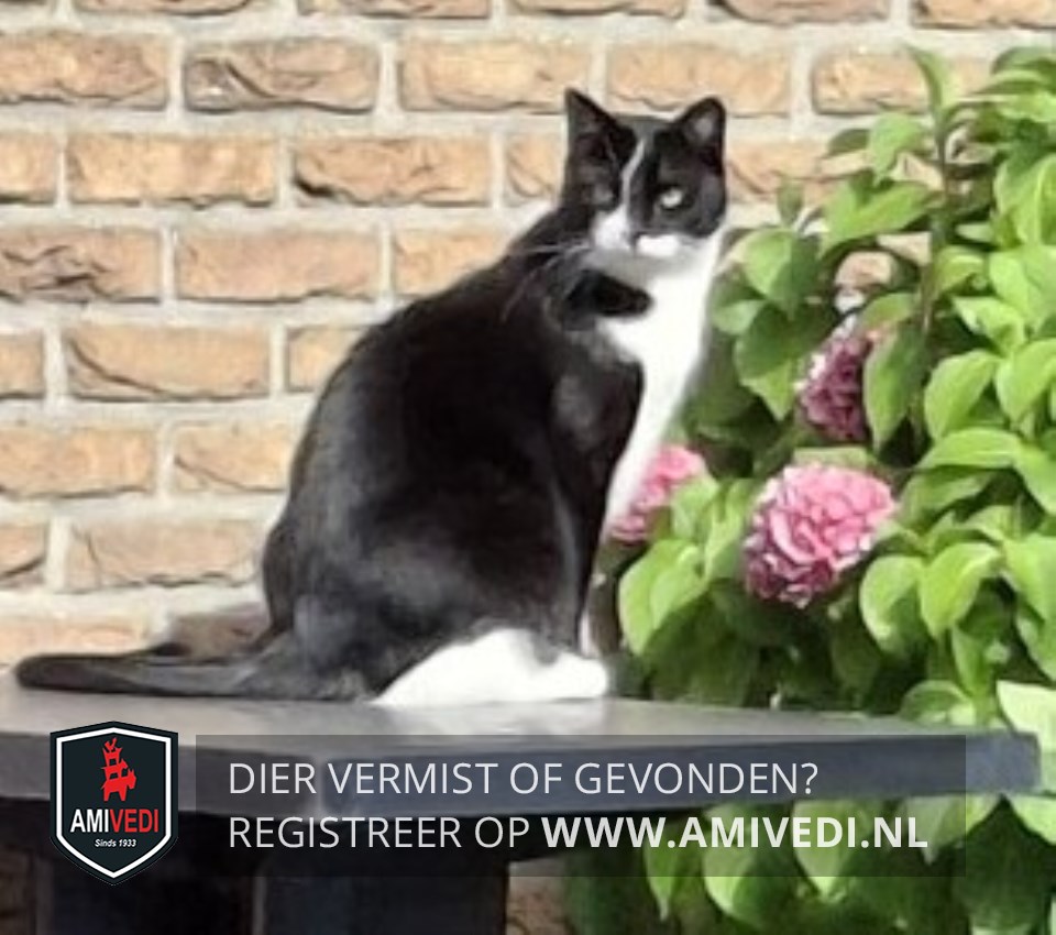 | Signalement | Witte achterpoten zwart lijf en staart witte voorpootjes en witte lijn over hoofd voorkant |