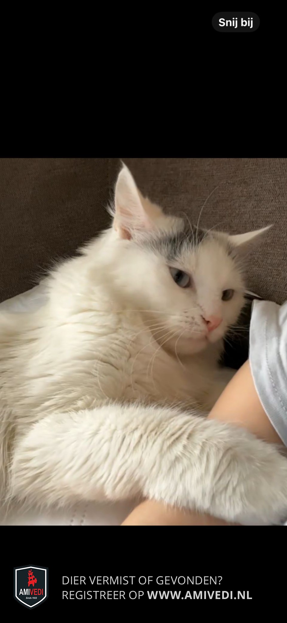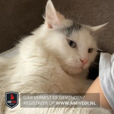 | Signalement | Geheel langharige witte poes met alleen op de kop een grijze vlek direct boven het rechter oog. |