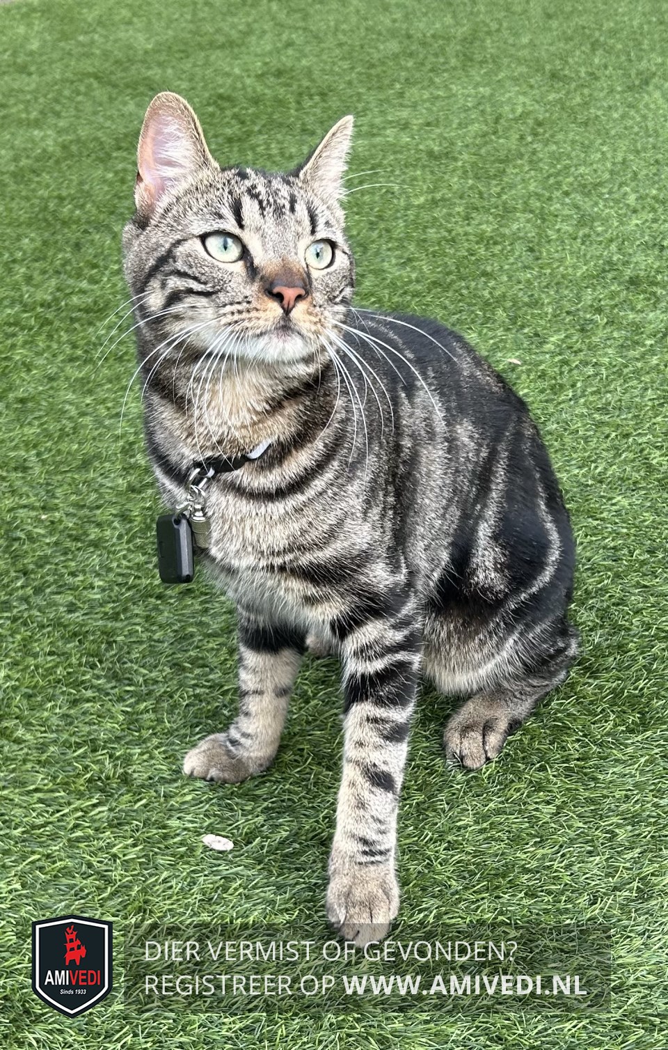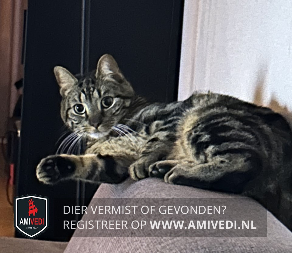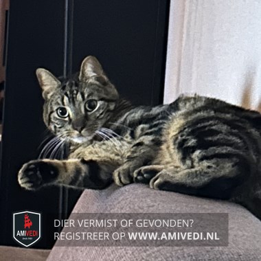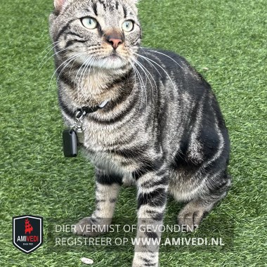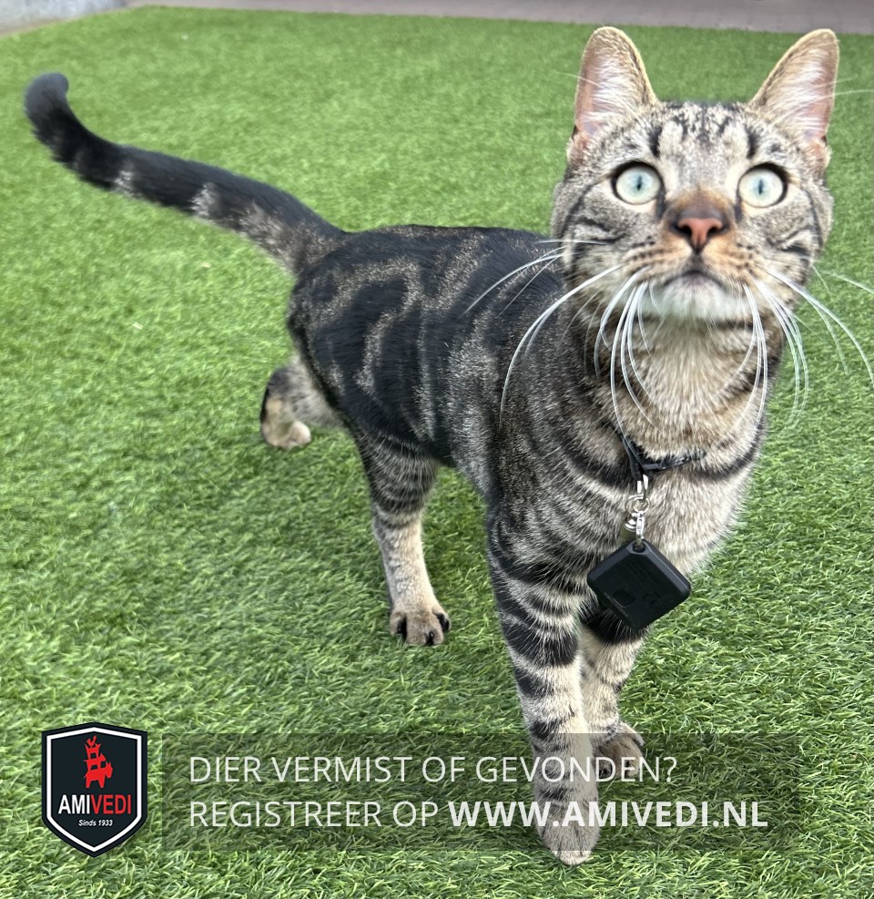 | Signalement | Zwart/bruin gestreept, lichter bruin/zwart gestreept op de kop, groene ogen, donkerbruine neus, witte kin, lichtbruine bef, donker gemarmerd op de rug, lichter bruin/zwart gestreepte poten, zwart geringde staart. Zie foto’s. Groene ogen, zwart, beige gestreept. Schuw en snel. |