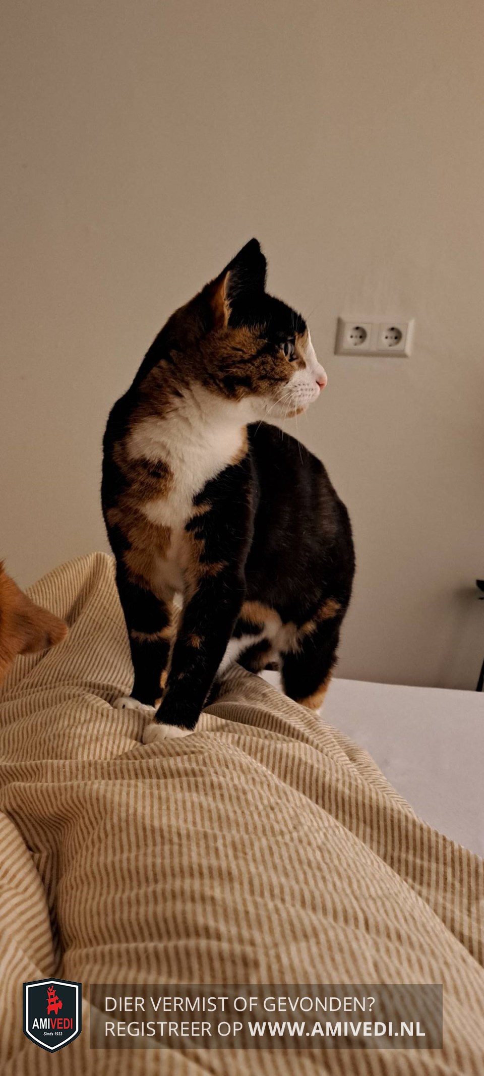 | Signalement | Lapjespoes, de oren zijn rood/zwart, klein rood vlekje bovenop de kop, witte bles doorlopend naar de mond, kin, borst en smal tussen de voorpoten, witte onderbuik, linker kant van het gezicht is zwart, rechterkant van het gezicht is boven het oog zwart, rondom het oog en wang cypers rood, links naast het witte op de borst is de vacht vnl zwart met een randje rood, rechts naast het witte is de vacht breder rood met zwart, de rug is links vnl zwart en rechts gemêleerd zood-zwart, zwarte voorpoten met witte voetje, op de rechter voorpoot zit een rode streep, op de linker voorpoot twee rode stippen, witte kniekousjes achter, gemeleerde staart. |