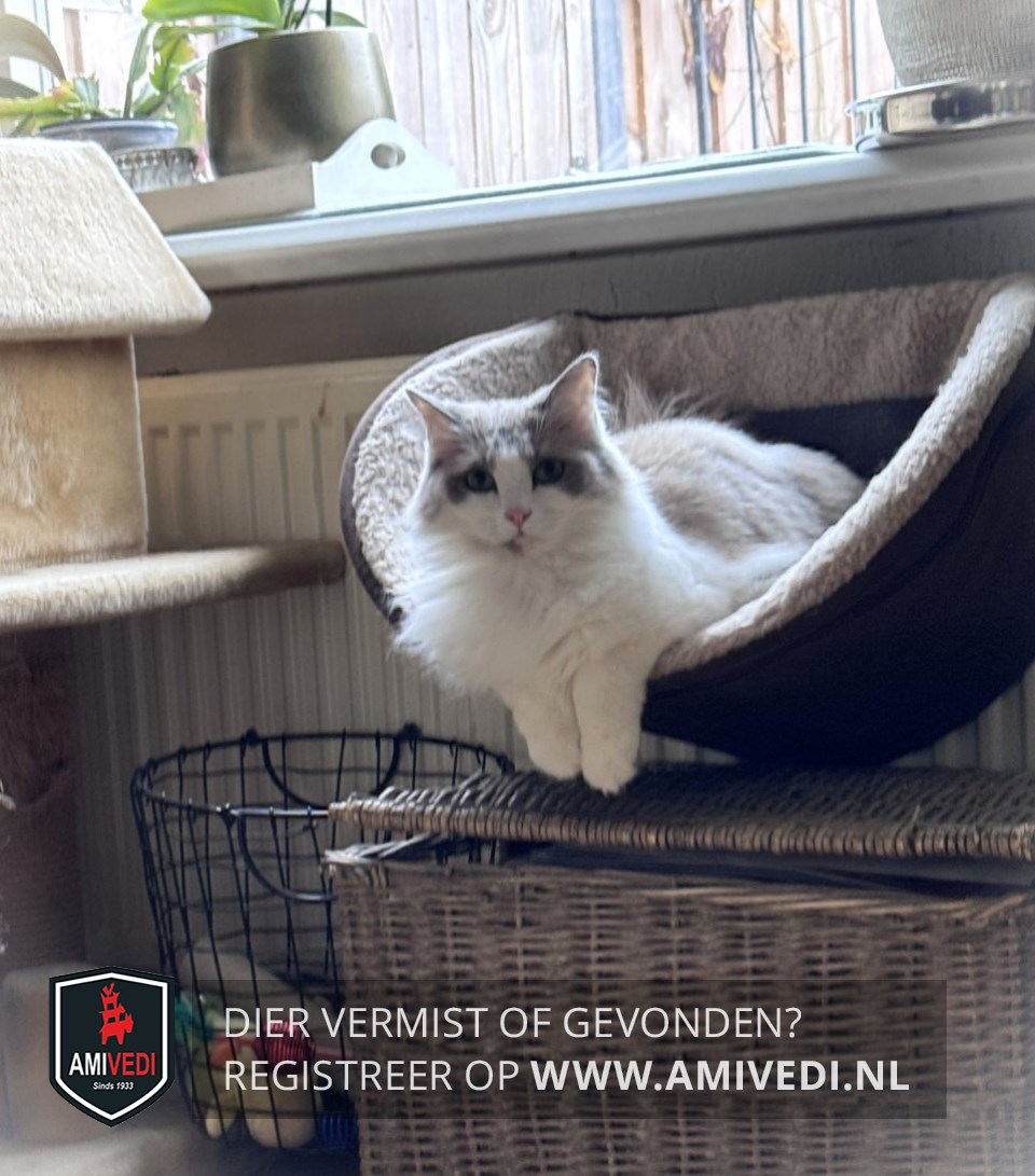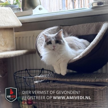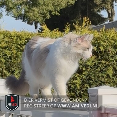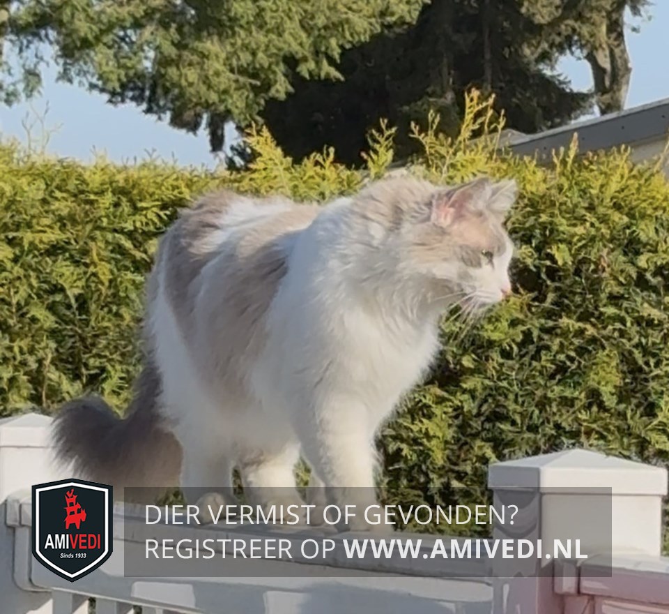 | Signalement | Wit met grote beige vlekken op haar rug. Een grijze tekening rond haar ogen en een kleine grijs/beige vlek op haar kin, een bruin/grijze pluimstaart en is schuw. |