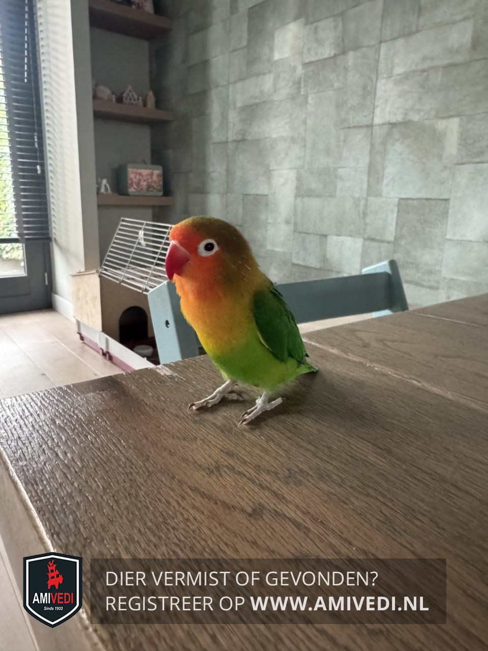 | Signalement | Agapornis fischeri van 10 cm groot. Kop; voorhoofd en wangen oranje, achterhoofd groen/oranje. Borst geel. Buik groen. Vleugels donkergroen. |