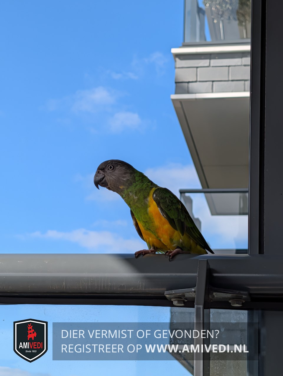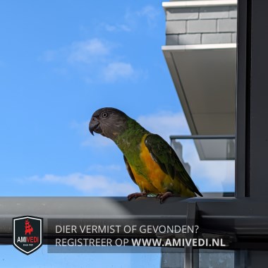 | Signalement | Meyer-papegaai of Bonte BoertjeL Oranje buik, groene veren, grijs kopje, zwarte snavel. Handtam |