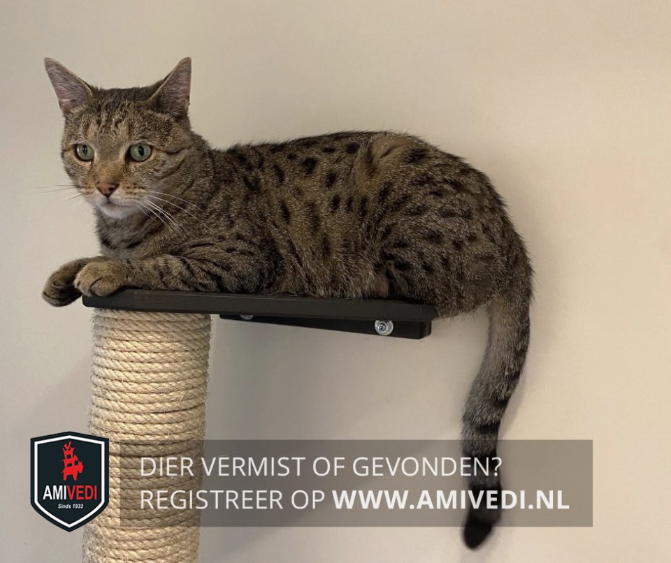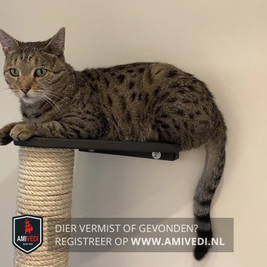 | Signalement | Bengaal in de kleuren bruin/zwart en een klein beetje wit. De kop is bruin van kleur met op de pet zwarte verticale strepen. Boven elke oog een zwarte verticale streep. Naast de ogen een horizontale zwarte streep. Ook een horizontale streep in zwart over de wangen. De ogen van de kater zijn groen en de pupil is ovaal van vorm. De bles is bruin en de neus is roze. Het bekje is wit met witte snorharen. De hals is bruin met horizontale zwarte strepen. De rug is bruin met zwarte stippen. De staart is bruin met horizontale zwarte strepen evenals de poten. De voetjes zijn bruin met zwart tussen de teentjes. |